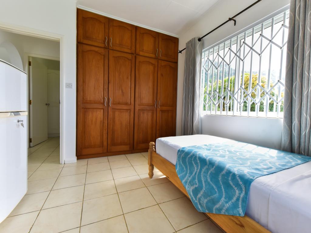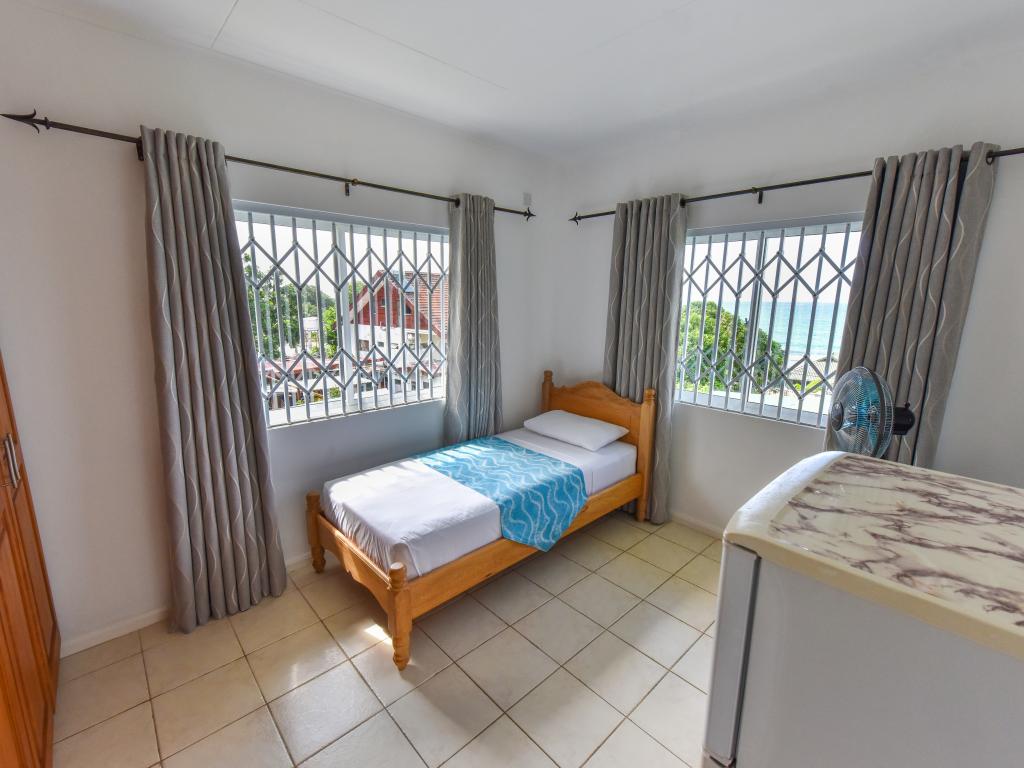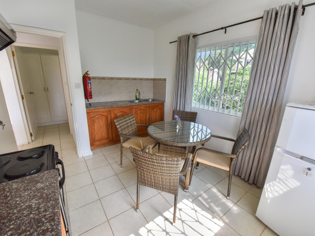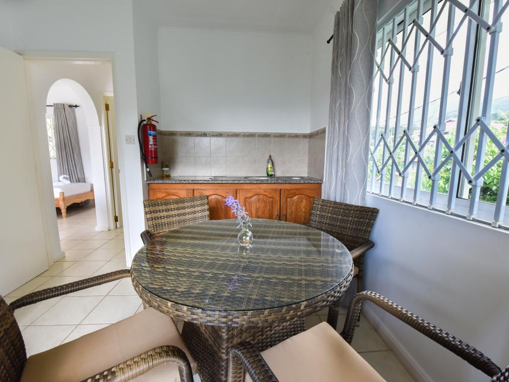 Because of the beautiful view definitely book the upper apartments. Clean, but decor a bit older. Also applies to the bathroom. Breakfast ok. Who is afraid of dogs, in the neighboring house lives a very attentive German shepherd. Small supermarket and takeaway in the vicinity. The beach within walking distance (2 minutes) is no reason for a Seychelles trip, but ok. If you do not have a rental car, you can take the bus a few stops to the Fisherman Cove Hotel and H-Hotel. Between these two hotels, a concrete path goes along a stream to the Beau Vallon (about 5 minutes)