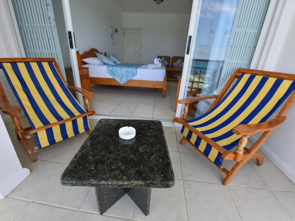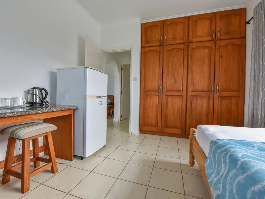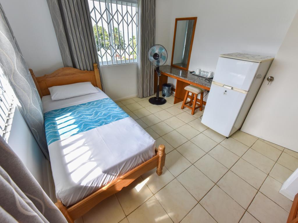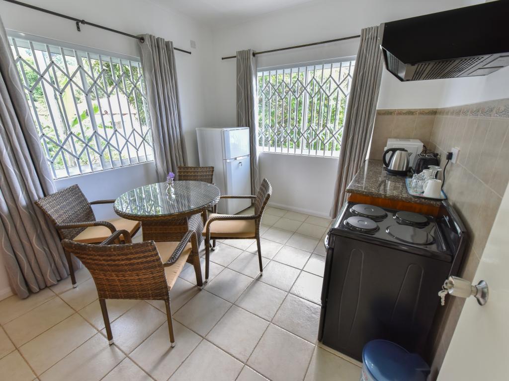 Because of the beautiful view definitely book the upper apartments. Clean, but decor a bit older. Also applies to the bathroom. Breakfast ok. Who is afraid of dogs, in the neighboring house lives a very attentive German shepherd. Small supermarket and takeaway in the vicinity. The beach within walking distance (2 minutes) is no reason for a Seychelles trip, but ok. If you do not have a rental car, you can take the bus a few stops to the Fisherman Cove Hotel and H-Hotel. Between these two hotels, a concrete path goes along a stream to the Beau Vallon (about 5 minutes)