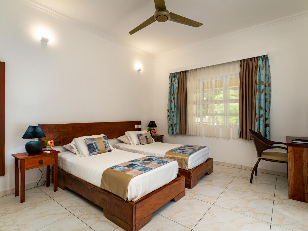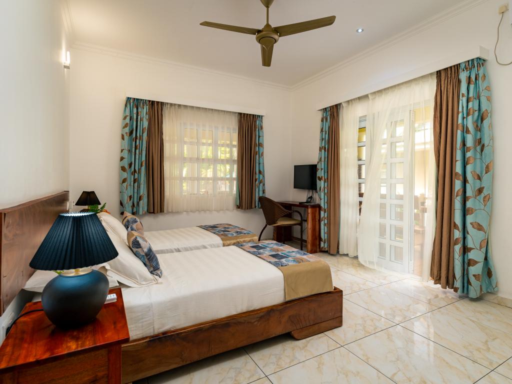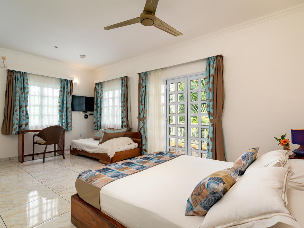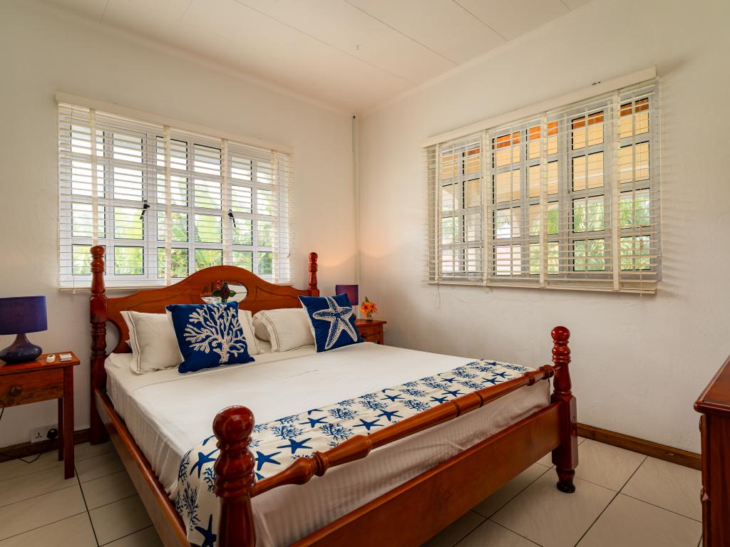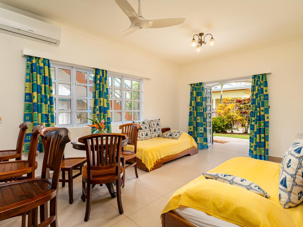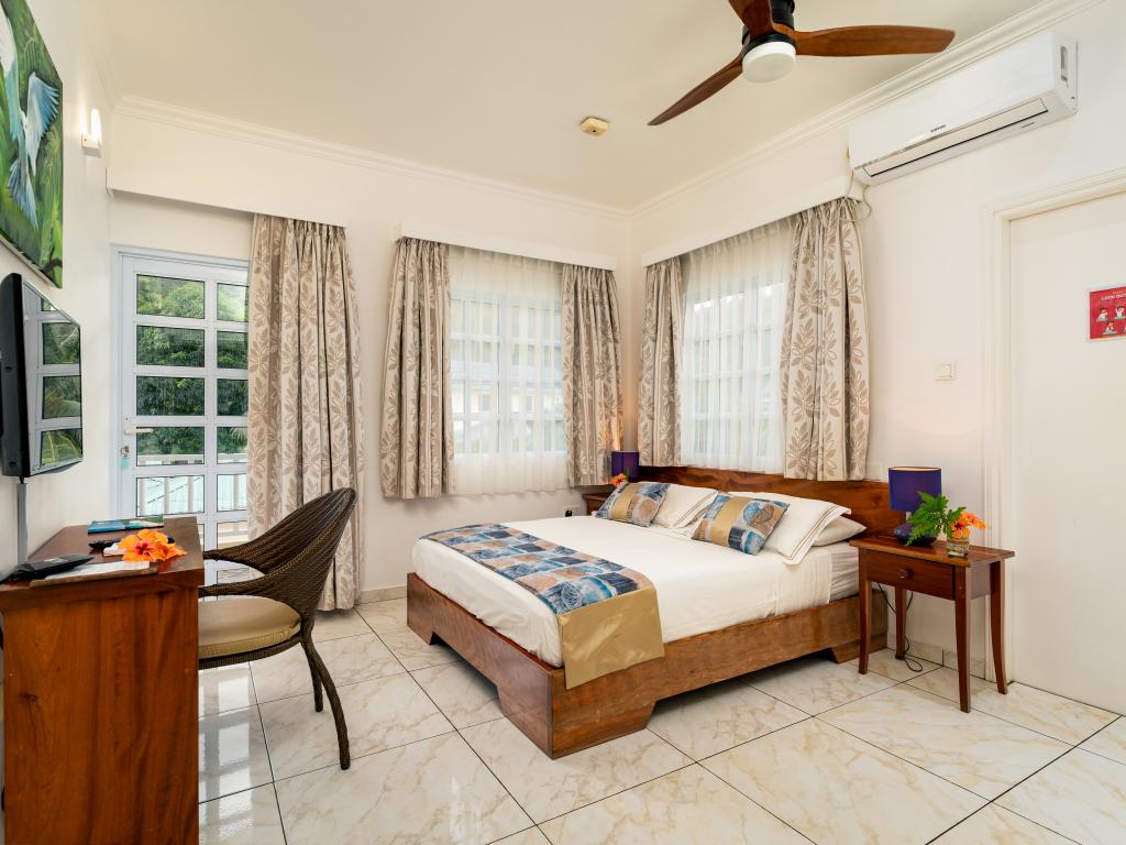 A very nice, stylish guesthouse (the beach is just across the road, a 2-minute walk) with lovely rooms, each with a balcony. We had mountain views and could admire the fruit bats taking flight every evening. Breakfast was typical of the region and served on a beautiful terrace. The entire staff, including the owner and the organizer Amanda, anticipated our every need. Just a few minutes away is a Hilton hotel where we could sign up for the themed buffet dinners (20% discount through the guesthouse). We particularly recommend the Creole evening with music and dance performances. Directly opposite, there's a shop and a highly-rated takeaway. We recommend renting a car to explore the island. However, the bus is also an option, as we frequently encountered it on the narrowest sections of the road. Mahé feels significantly busier than Praslin and La Digue, but here in the southeast, you can truly relax away from the hustle and bustle of Victoria.