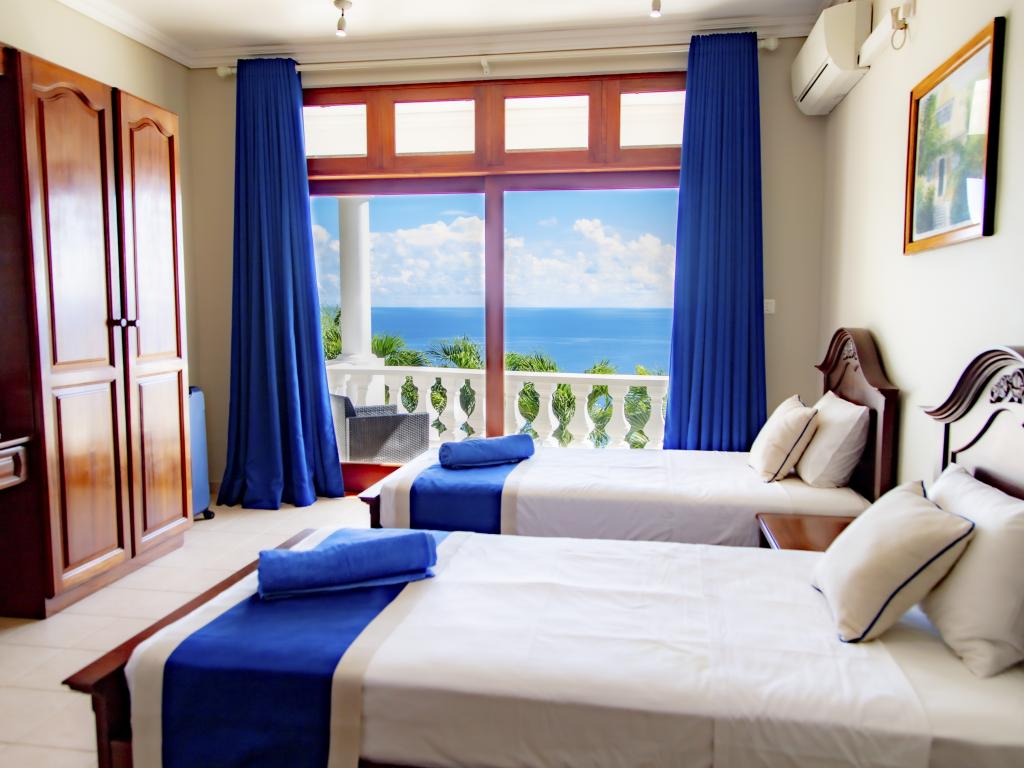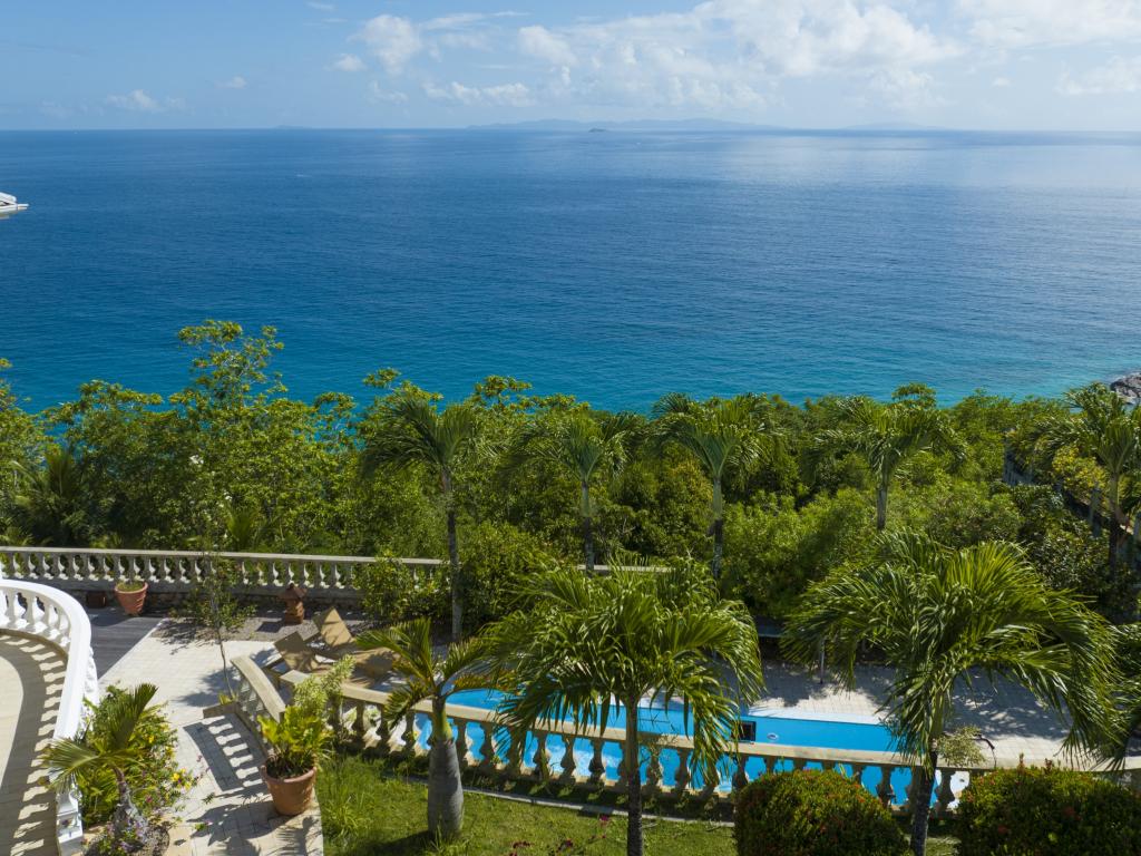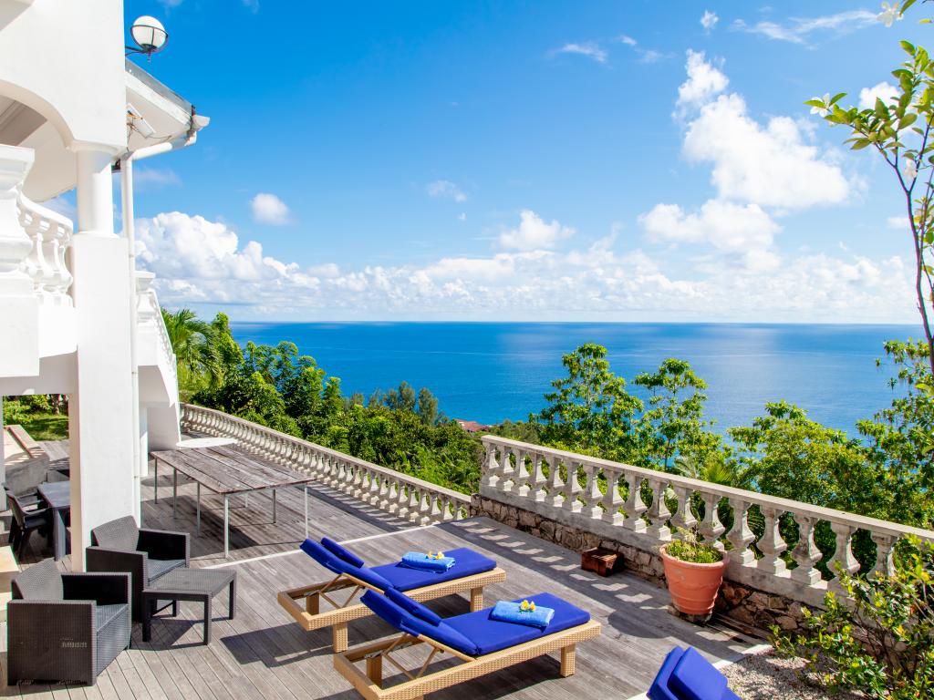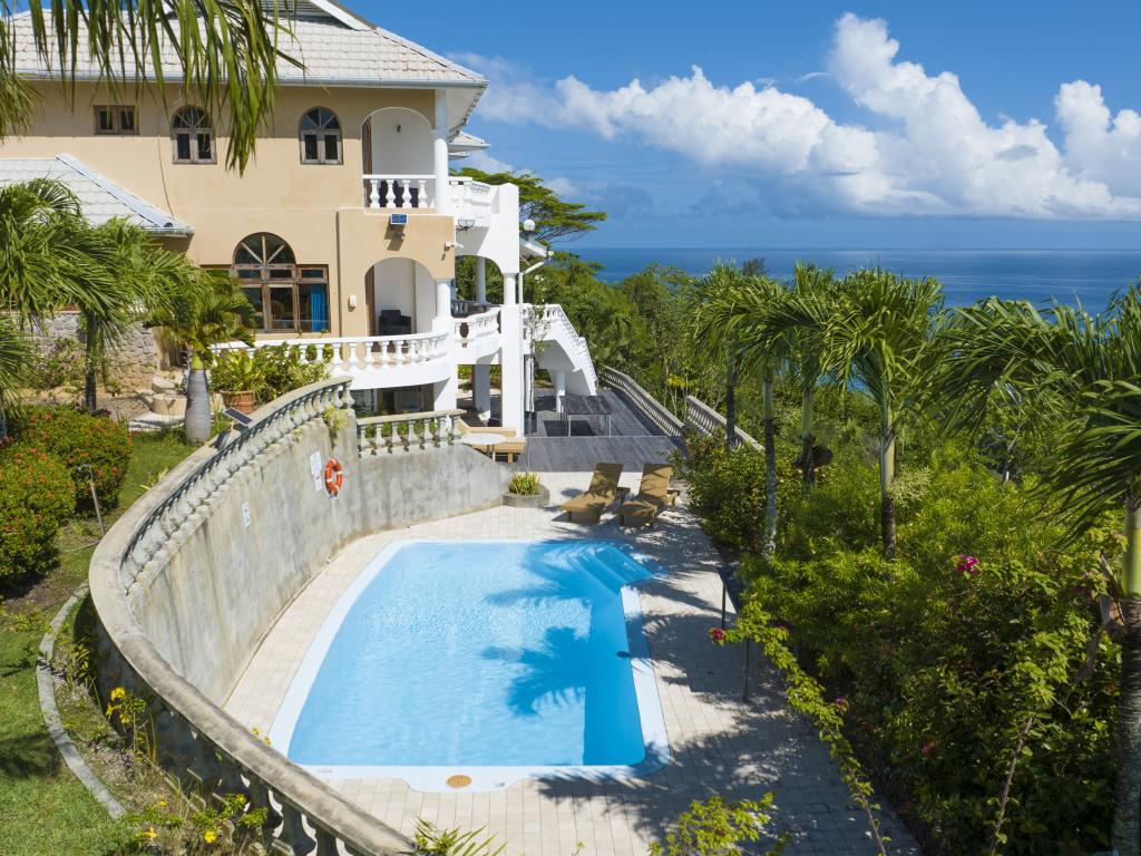 The elegant Blu Vista Villa is located overlooking Carana Beach on Mahé. From here, you can enjoy a magnificent panoramic view of the sea and the neighbouring islands of Praslin and La Digue. The villa finds itself on a spacious, very well-maintained property with a pool and is surrounded by peace and quiet. The beaches of Carana and North East Point are within walking distance whilst the beach of Beau Vallon and the city centre of Victoria are approx. 9km away.