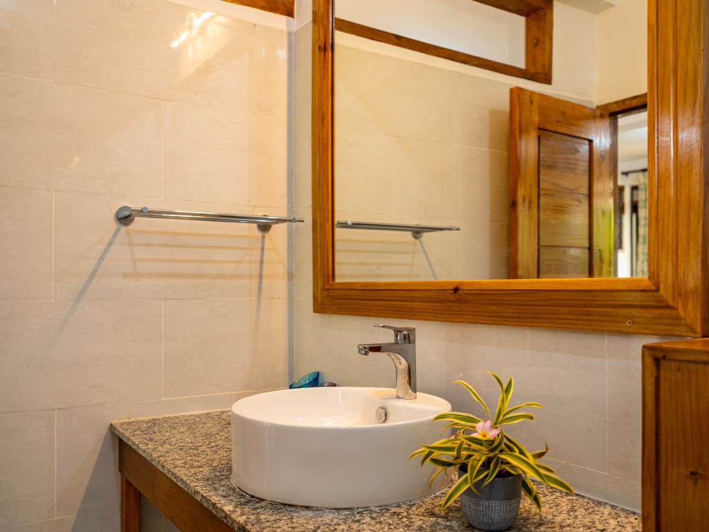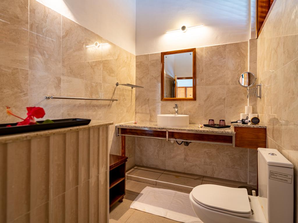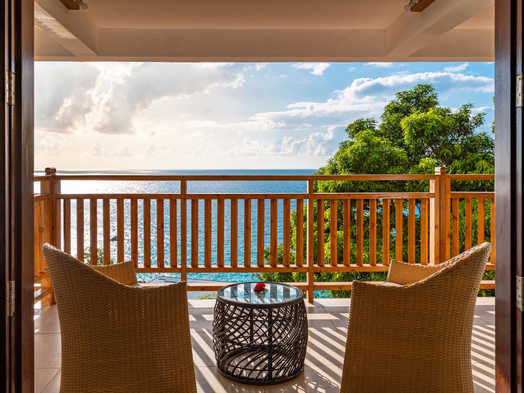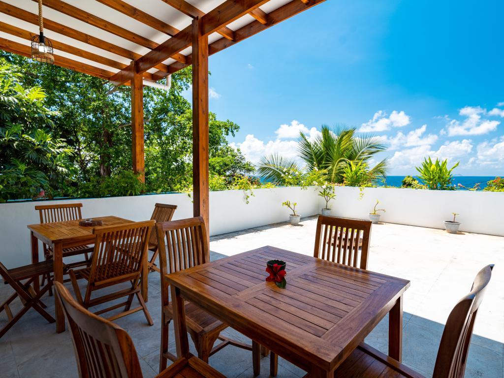 Translation (DE): GoogleTranslateFantastic location! The view from the rooms is spectacular, with a sea view from the bed and a stunning sunset in the evenings. The driveway is quite steep, but that's not a problem as there's plenty of parking. Cecil and her staff go out of their way to ensure their guests have a pleasant stay. Everything was spotlessly clean and well-maintained, and the rooms are beautifully furnished and practically brand new. Breakfast was excellent and varied. We also ate dinner there twice, and the food was very good. There's a lovely beach nearby, but we drove there as well. There's no sidewalk, and the roads are rather narrow. Otherwise, the location was good; the nearest town with a long beach and restaurants is about a 10-minute drive away, so a car is recommended. Alternatively, you can take the bus. If we were to vacation here again, we would definitely book Sunbird Villas again. Thank you for the wonderful stay!