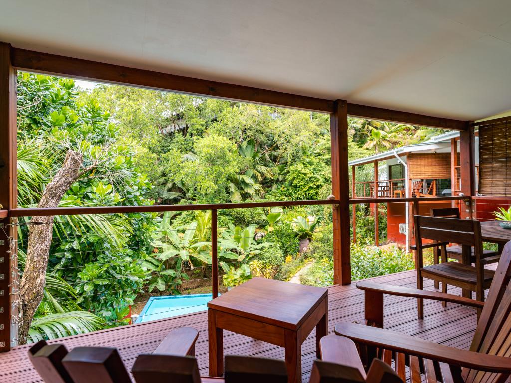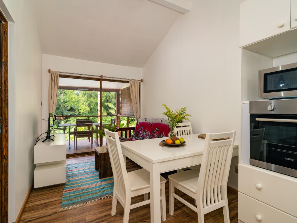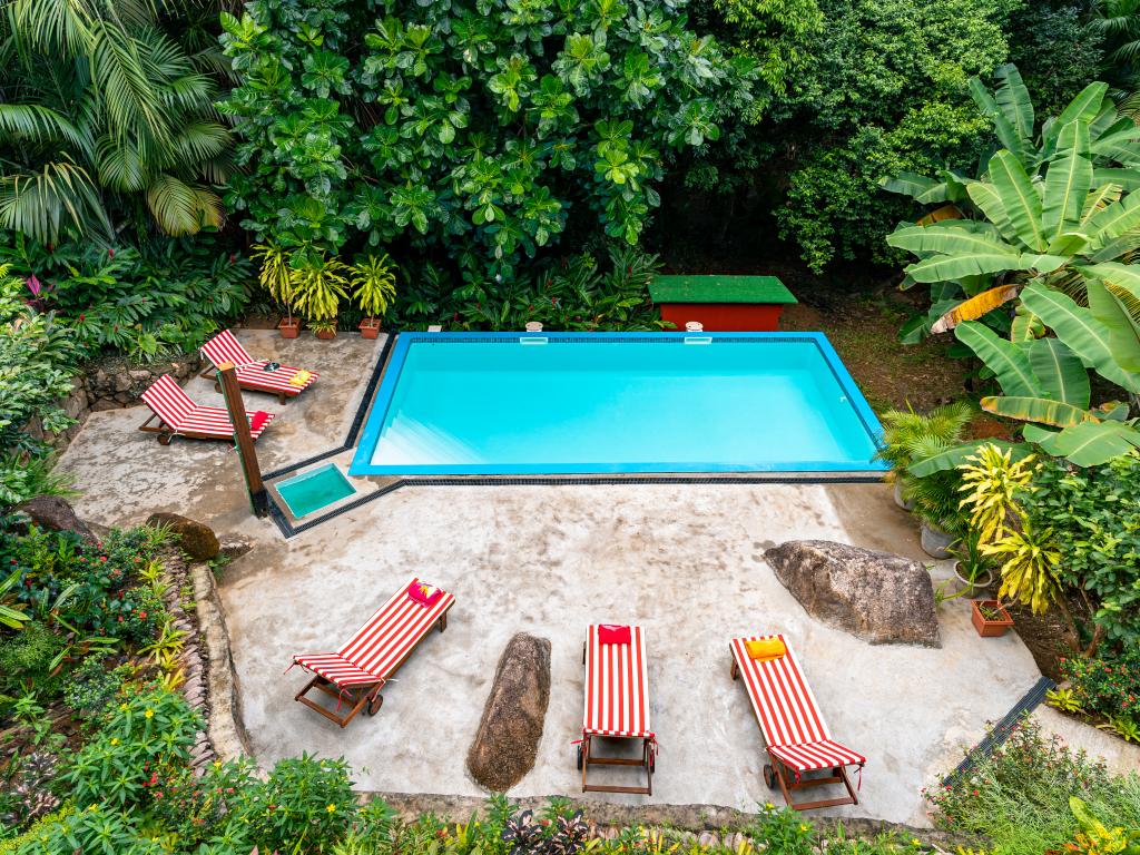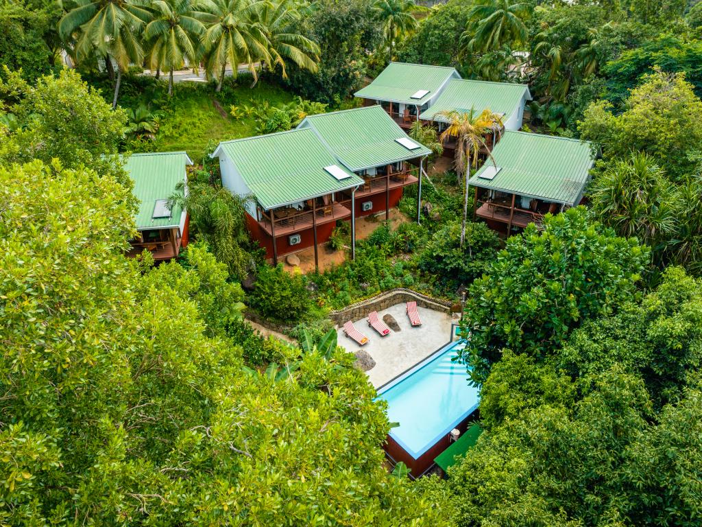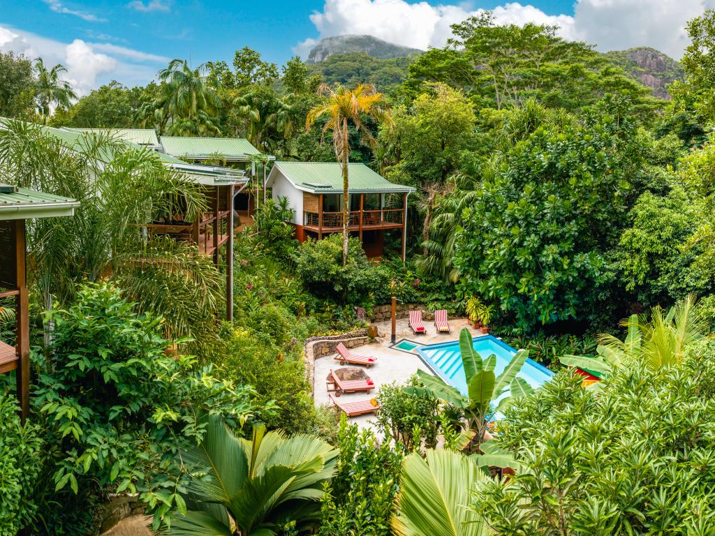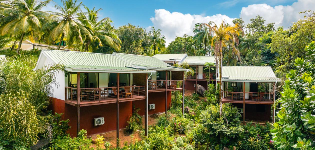 The Cashew Nut Grove Chalets in Port Glaud on Mahé have been carefully designed to blend harmoniously with the tropical forest surroundings. This comfortable self-catering accommodation offers a peaceful and eco-friendly retreat for your holiday. The lush green grounds also feature a beautiful saltwater pool. Restaurants, shopping facilities, and the beaches of Grande Anse and Port Launay are conveniently reachable within a few minutes by rental car.
