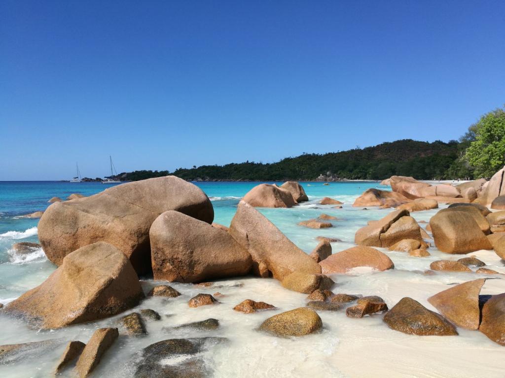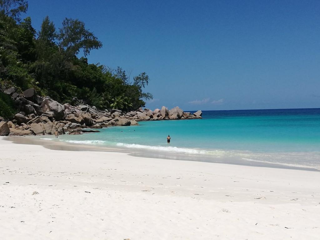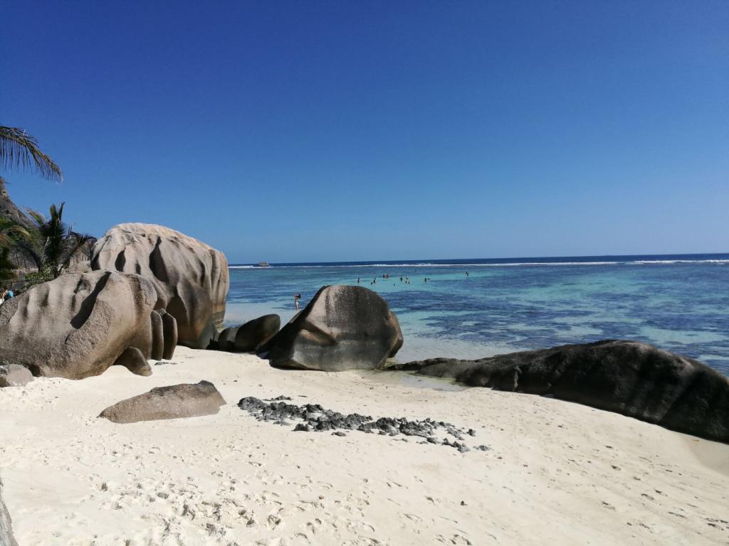 Von Budapest aus (wo wir aktuell wohnen) ging es via Dubai auf die Seychellen, auf Mahé, und von dort mittels Fähre auf La Digue, wo unsere Reise begann. Die kleine Insel ist fußläufig oder per Rad erschließbar. Wir kamen im Etoile Labrine unter; ein kleines, familiär geführtes Guesthouse, bestehend aus sehr sauberen Bungalows, großem Bad und eigenem Garten. Die Besitzerin erkundigt sich zu Beginn und im Laufe des Aufenthalts nach unserem Befinden, half mit Insiderinfos aus und unterstützte auch bei organisatorischen Dingen, wie das Buchen von Fahrrädern. Also steuerten wir fortan per Rad sämtliche Traumstrände und -buchten an, wie den berühmten Anse Source d'Argent (Eintritt 100 SCR pP) im Südwesten der Insel, Grand Anse und Petite Anse, Anse Cocos im Südosten sowie Anse Severe und Anse Patates im Norden auf zwei Rädern an. Letztgenannte Strände eignen sich besser zum Schnorcheln, wo man sich neben der Entdeckung der vielfältigen und bunten Fischfauna auch über Schildkröten und Rochen erfreuen kann. Acht geben sollte man jedenfalls aber auf die mitunter starken Strömungen.