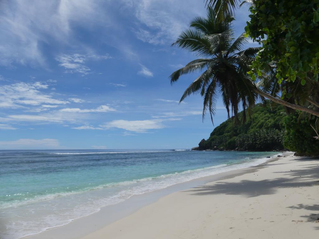 Der Hausstrand hier Anse Volbert (Cote d'Or) ist mit seinem flachen Wasser und dem palmengesäumten weißen Sandstrand ein Traum. Anse Volbert, Praslin