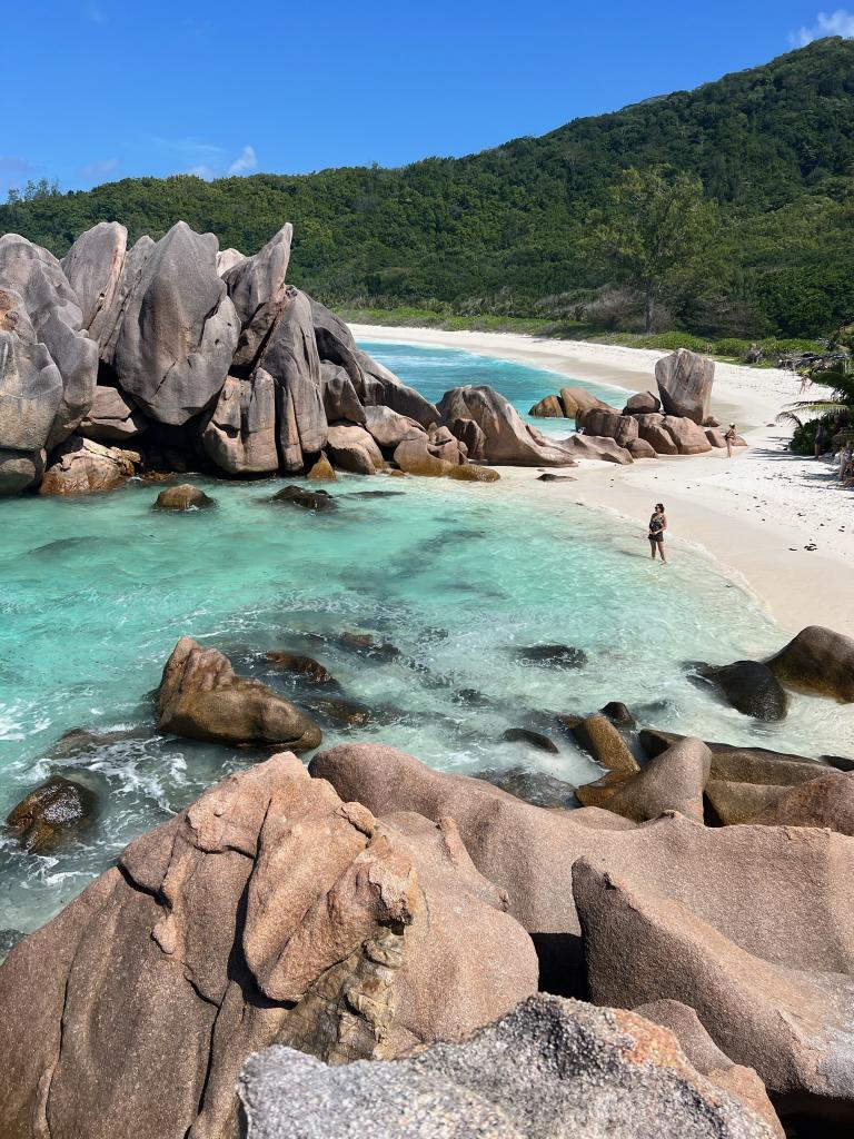 Am letzten Tag auf La Digue wollten wir einen entspannten Strandspaziergang an der Ostküste machen. Als der Weg endete und sich sehr hohe Felsen aneinander reihten, wurde unsere Neugier geweckt, die Felsen zu erklimmen. Wir sind sehr oft an unsere Grenzen gekommen, können aber heute stolz behaupten, La Digue zu Fuß umrundet zu haben. Vorbei am Rock Pool waren wir am Petite Anse dankbar über die Strandbar, die uns einen Fruit Mix anbot und zum Mittagessen einlud. Endlich am Hotel angekommen, verbrachten wir den restlichen Tag am Strand. Aufgrund der hohen Felsen und Wellen ist Schwimmen auf La Digue jedoch nicht so entspannt wie auf Praslin.