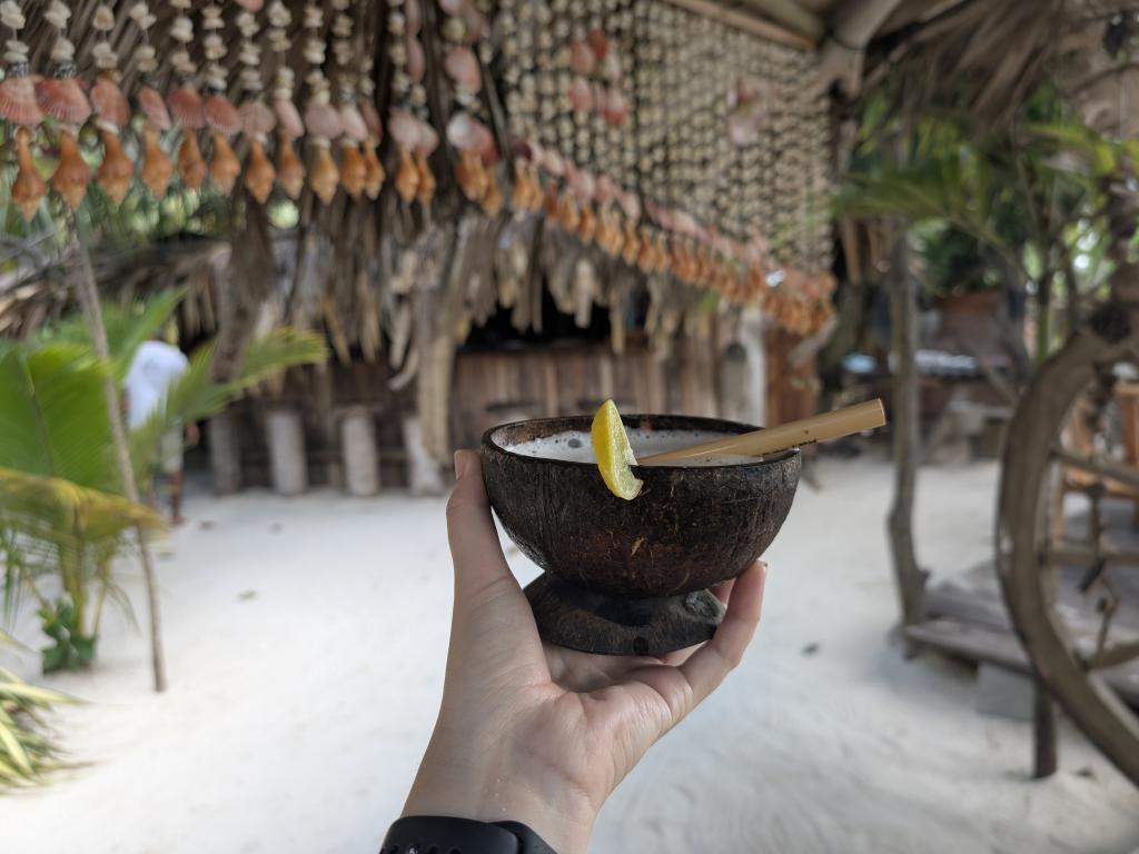 On our way back we stopped at the Natural Bar, which had already spoken to us from the special decorations before. We got some fresh juices in coconuts and enjoyed the ocean view. For dinner we were expected back at the Secret Villa, which was delicious on both evenings and the team went the extra mile to prepare a special vegan meal and dessert for us!