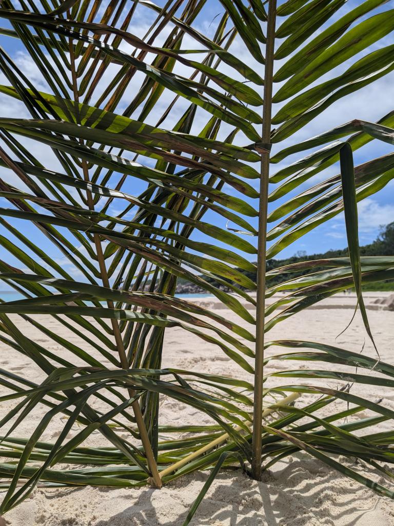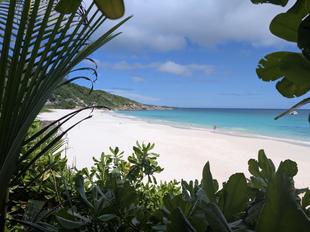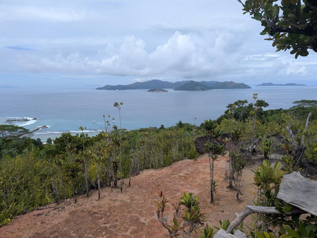 What really blew our mind was the Petite Anse which we visited the next day. Our bike ride took us along the Veuve Nature Reserve to the Grand Anse. The Grand Anse was already very beautiful, though quite crowded. Following the recommendation of the local bar owner we decided to go on a small hike over the hill on the eastern end of the Grand Anse and were rewarded with the most beautiful beach we saw on our entire trip to the Seychelles. Big waves, but crystal clear water, white sand and nearly no visitors. We built ourselves a small shadowy shelter between the big rocks at the end of the beach and enjoyed the breath taking views and jumped in the waves.