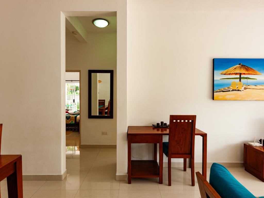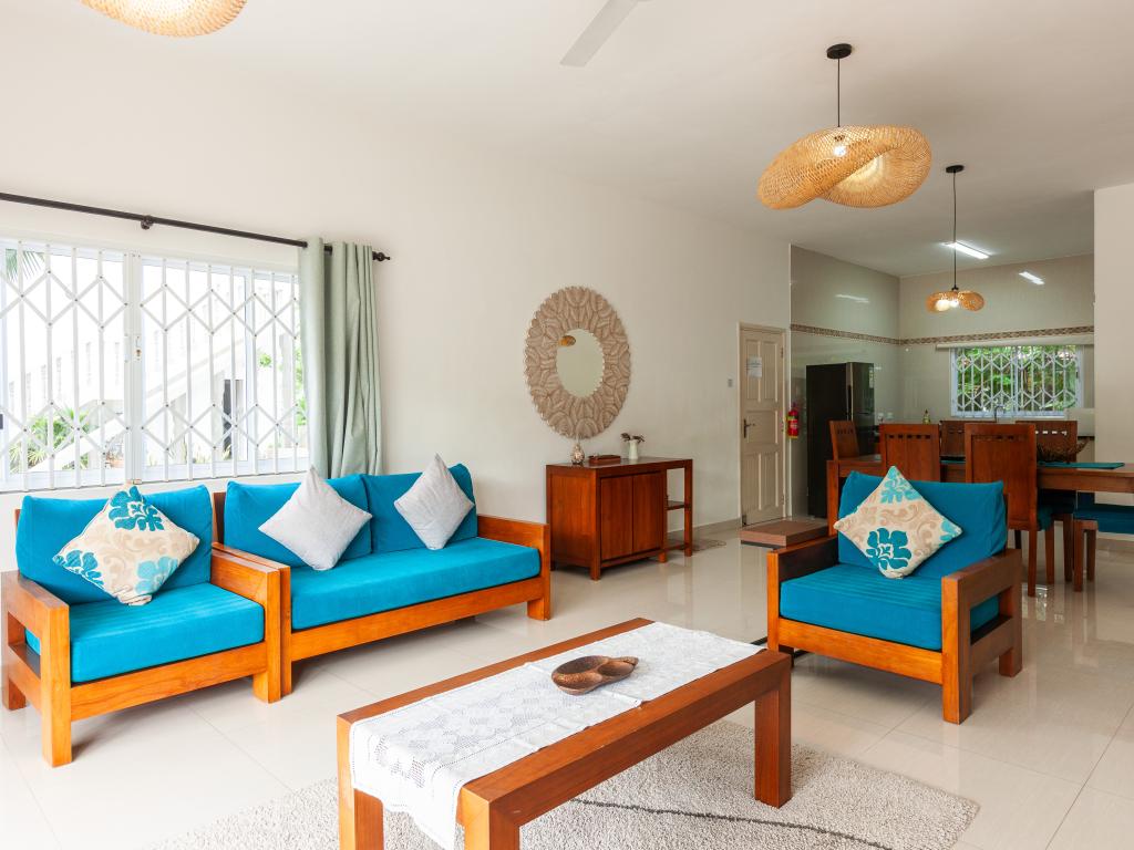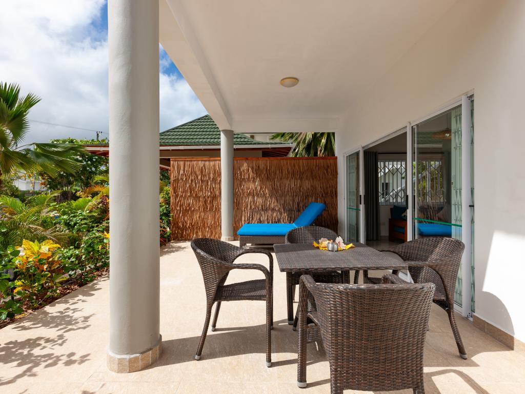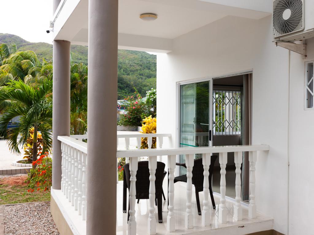Nous sommes à quelques centaines de mètres de l'entrée de l'hôtel où se situe l'Anse Georgette et avec des commerces restaurants et plats à emporter très proches. Étant 4 amis, nous avons opté pour un appartement de deux chambres et deux salles de bains. Le bâtiment de deux étages est vraiment bien entretenu. Grande cuisine avec séjour et une splendide terrasse idéale pour les repas ou pour un moment de détente dont nous avons énormément profité. Cuisine équipée avec tout le nécessaire pour préparer quelque chose. Salles de bains spacieuses avec douche. Air conditionné et ventilateur dans les chambres, uniquement ventilateur de plafond dans le salon et la cuisine. Nettoyage quotidien de l'appartement. Grand jardin dans lequel garer la voiture si nécessaire. La propriétaire et son mari sont toujours présents, serviables et gentils et pleins de conseils sur l'île. Par exemple, ils nous ont conseillé de rejoindre Anse Lazio, au lieu de faire le tour de l'île comme nous le pensions, en faisant un petit tronçon en voiture (environ deux km) puis une marche panoramique de 15 minutes. Vraiment de bons conseils.
