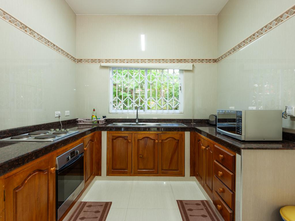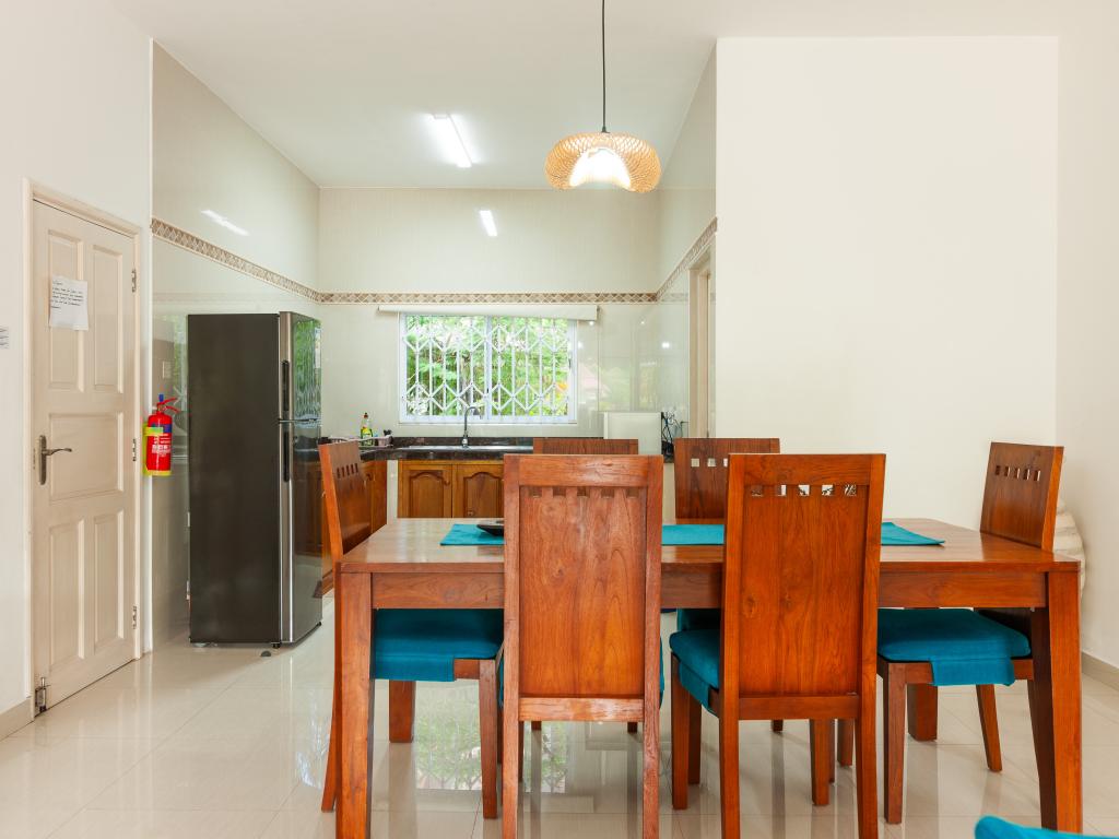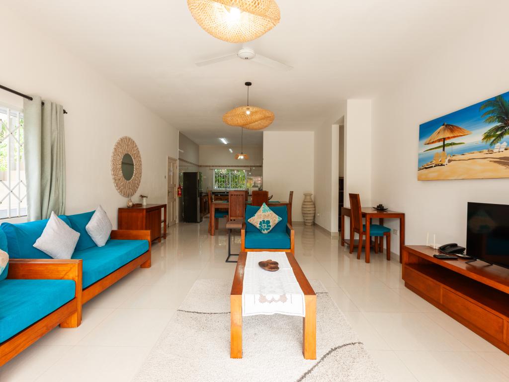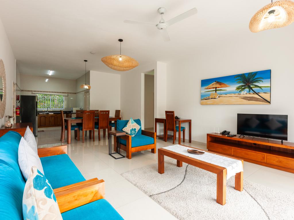 Nous sommes à quelques centaines de mètres de l'entrée de l'hôtel où se situe l'Anse Georgette et avec des commerces restaurants et plats à emporter très proches. Étant 4 amis, nous avons opté pour un appartement de deux chambres et deux salles de bains. Le bâtiment de deux étages est vraiment bien entretenu. Grande cuisine avec séjour et une splendide terrasse idéale pour les repas ou pour un moment de détente dont nous avons énormément profité. Cuisine équipée avec tout le nécessaire pour préparer quelque chose. Salles de bains spacieuses avec douche. Air conditionné et ventilateur dans les chambres, uniquement ventilateur de plafond dans le salon et la cuisine. Nettoyage quotidien de l'appartement. Grand jardin dans lequel garer la voiture si nécessaire. La propriétaire et son mari sont toujours présents, serviables et gentils et pleins de conseils sur l'île. Par exemple, ils nous ont conseillé de rejoindre Anse Lazio, au lieu de faire le tour de l'île comme nous le pensions, en faisant un petit tronçon en voiture (environ deux km) puis une marche panoramique de 15 minutes. Vraiment de bons conseils.