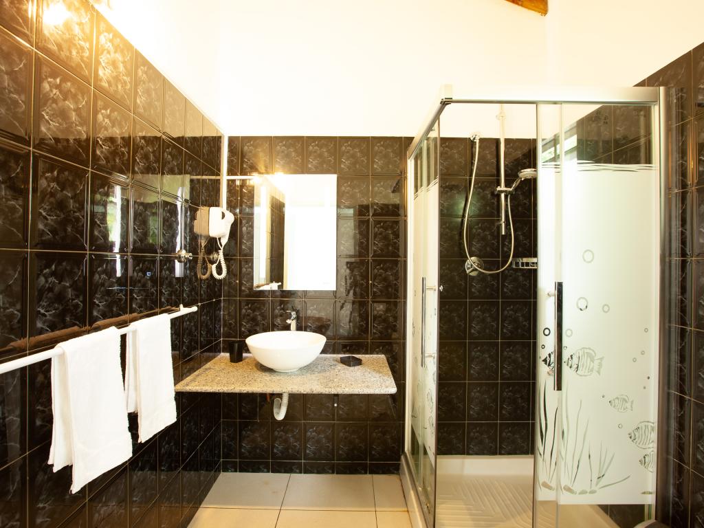 Translation (DE): GoogleTranslateLe réceptionniste était très sympathique et serviable. La chambre était très agréable et spacieuse, mais le lit était un peu dur et les oreillers peu confortables. La salle de bain était grande, avec une belle douche et beaucoup d'espace. Il y a eu une fois une coupure d'eau dans la cabane, probablement due à un dysfonctionnement de la pompe. L'espace extérieur était très joli et bien entretenu ; il y a même un jardin avec six tortues géantes. Le petit-déjeuner était le même tous les jours, mais il était très bon et complet : jus de fruits, thé, toasts avec confiture, œufs et fruits.