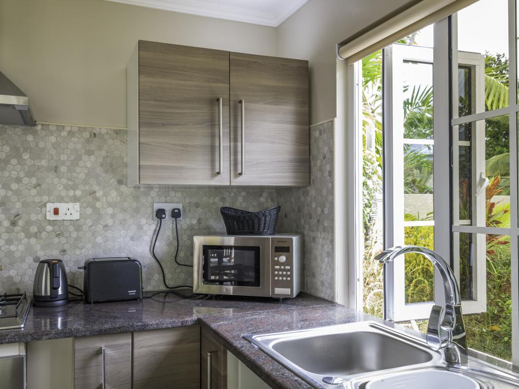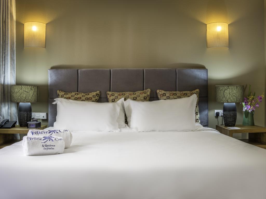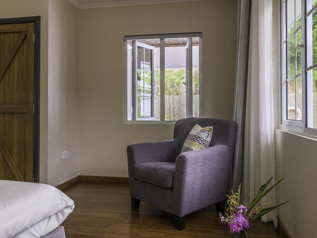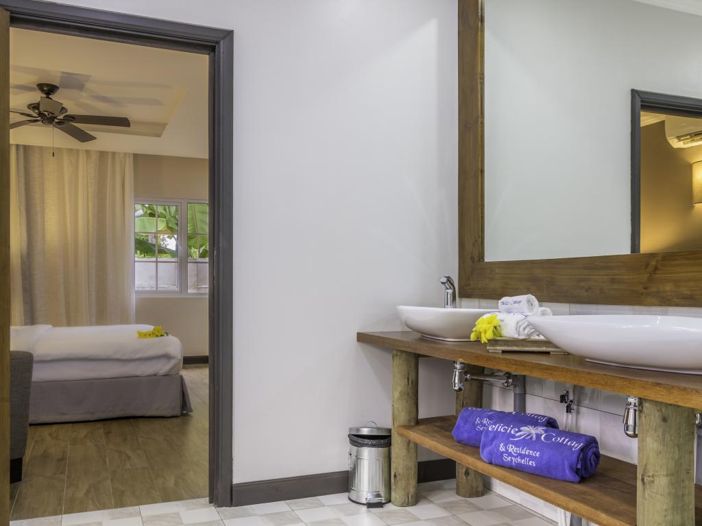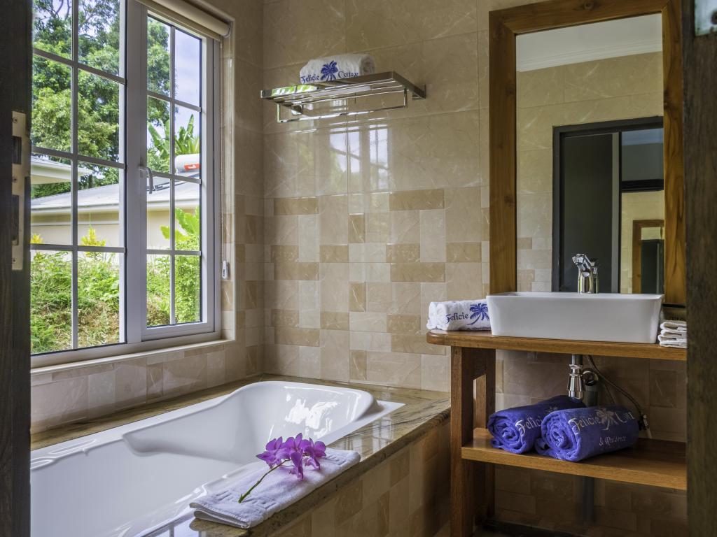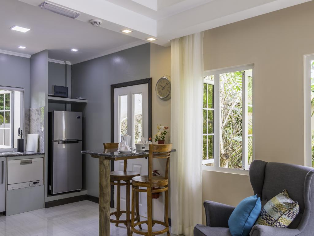 Une oasis de verdure entre une plage paradisiaque et des boutiques : Felicie Cottage & Residence dans le sud-est de Mahé offre la combinaison idéale pour ceux qui souhaitent passer des vacances tranquilles à deux (ou à trois), sans renoncer au confort. Une piscine commune, une plage accessible à pied ainsi que des restaurants, un arrêt de bus et des boutiques au coin de la rue. Que demander de plus ?
