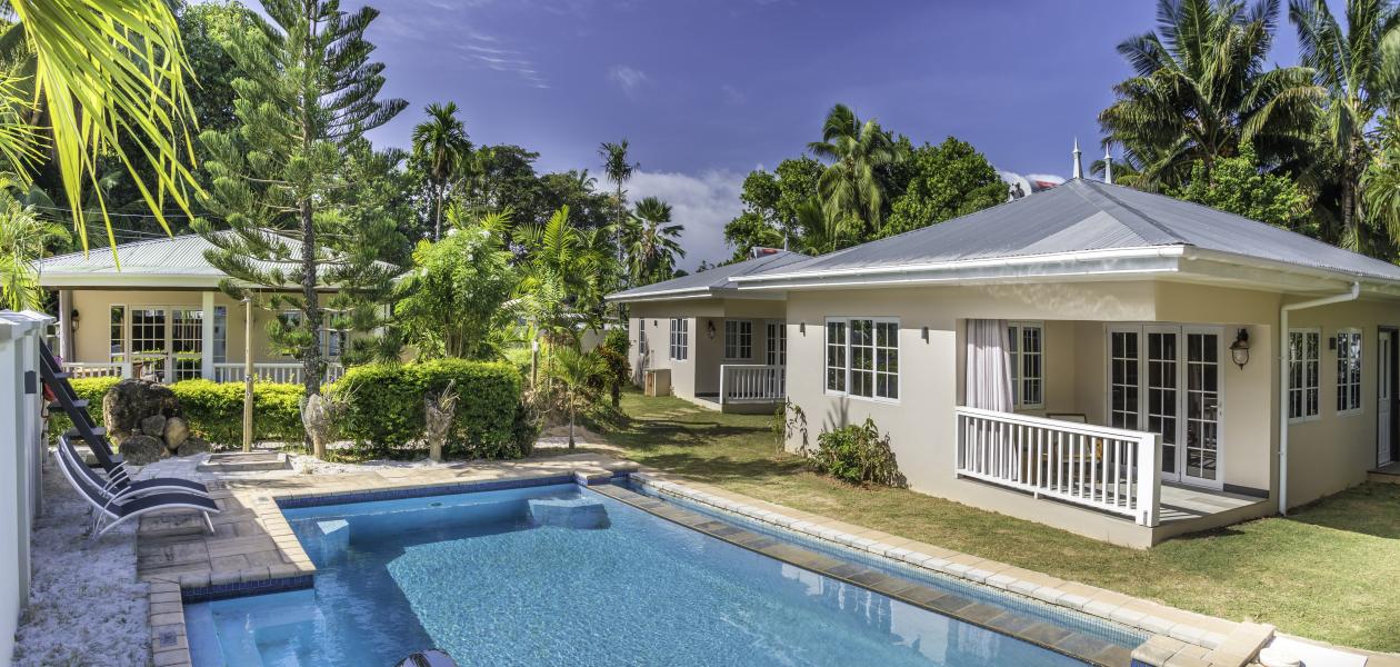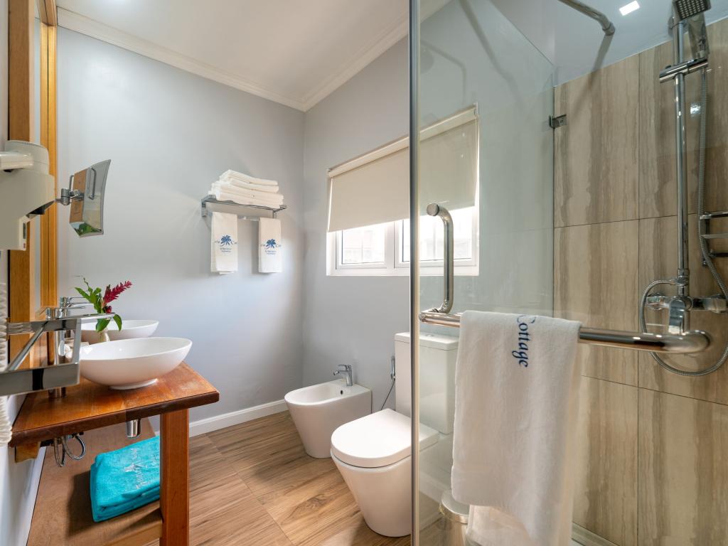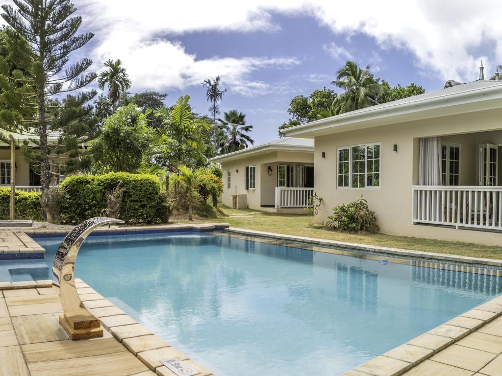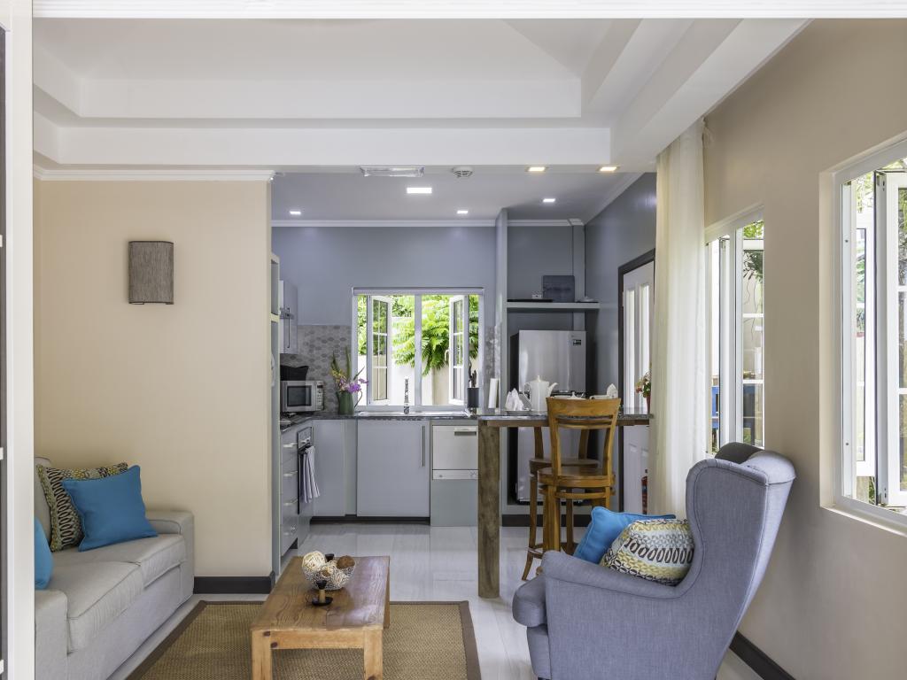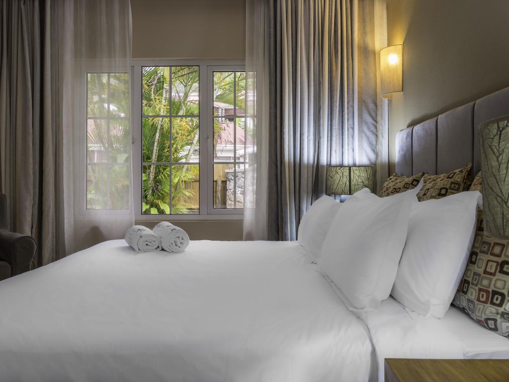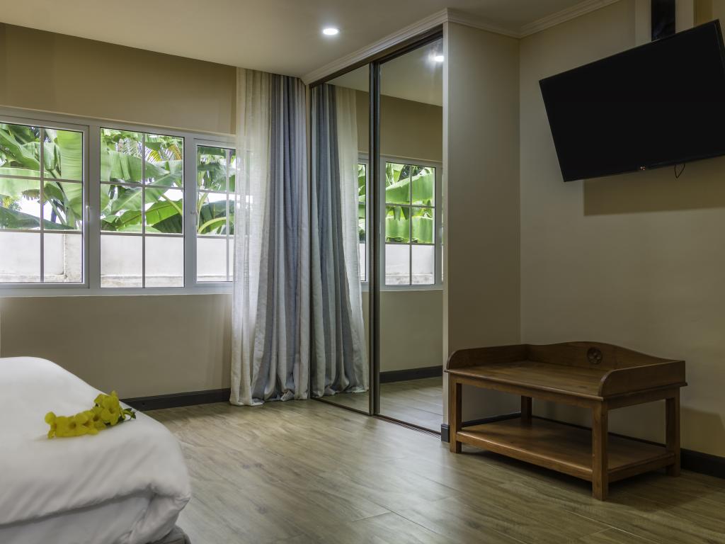 Une oasis de verdure entre une plage paradisiaque et des boutiques : Felicie Cottage & Residence dans le sud-est de Mahé offre la combinaison idéale pour ceux qui souhaitent passer des vacances tranquilles à deux (ou à trois), sans renoncer au confort. Une piscine commune, une plage accessible à pied ainsi que des restaurants, un arrêt de bus et des boutiques au coin de la rue. Que demander de plus ?