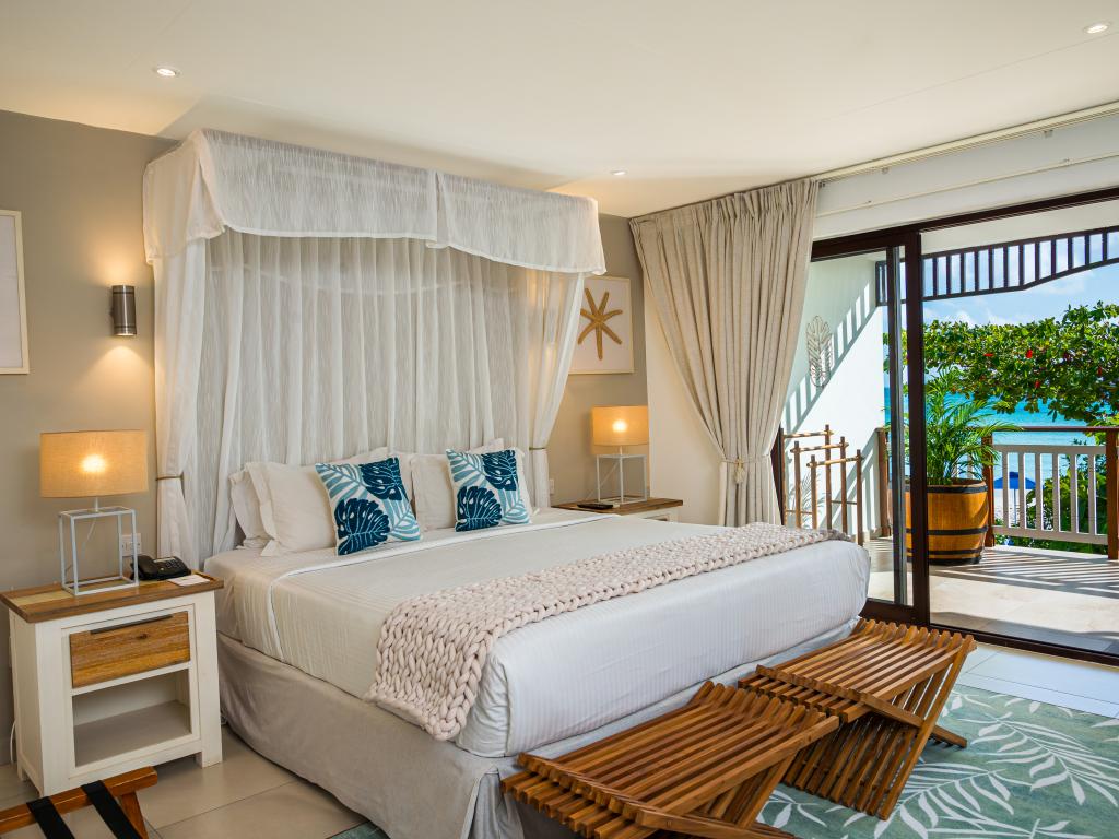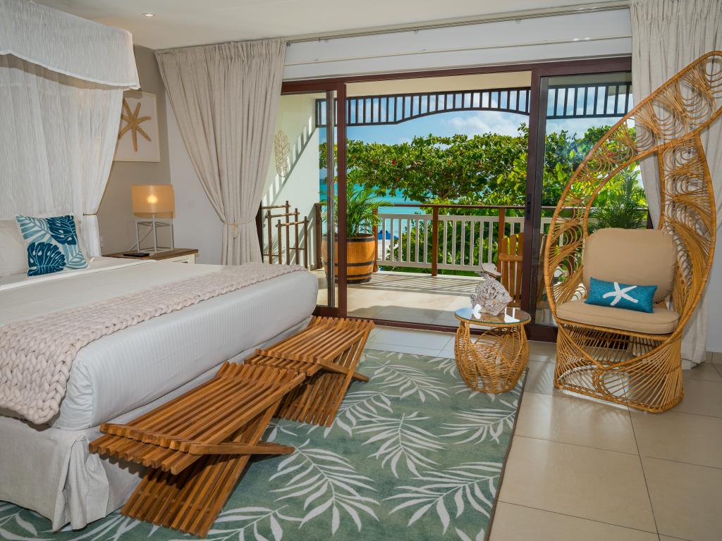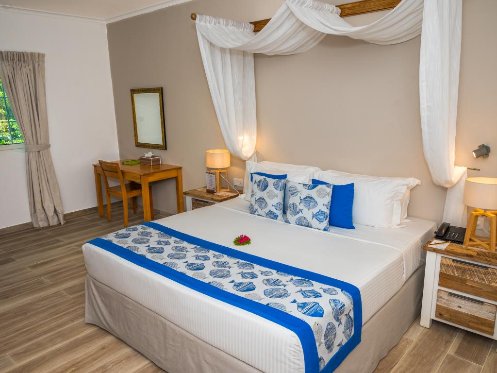 Les chambres modernes et aménagées dans des maisons sur pilotis exclusives de l'"Acajou Beach Resort", géré par la famille, se trouvent directement sur la plage de rêve de la Cote D'Or.