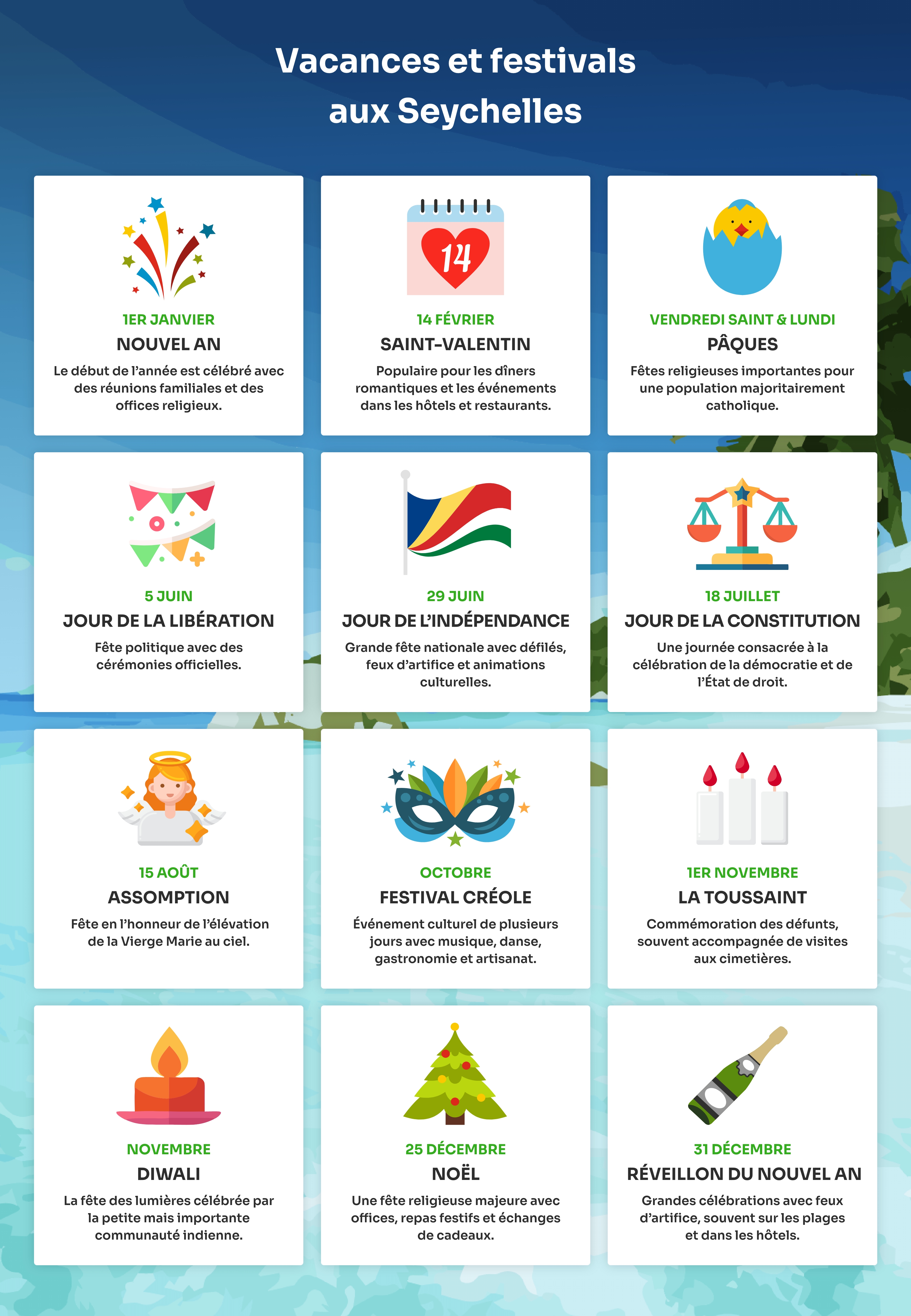 Pendant les jours fériés, les magasins et les banques peuvent être fermés, mais de nombreuses festivités publiques sont organisées, ce qui est idéal pour les découvertes culturelles. Les fêtes nationales et religieuses, en particulier, offrent des occasions de découvrir l'hospitalité et les traditions des Seychellois.