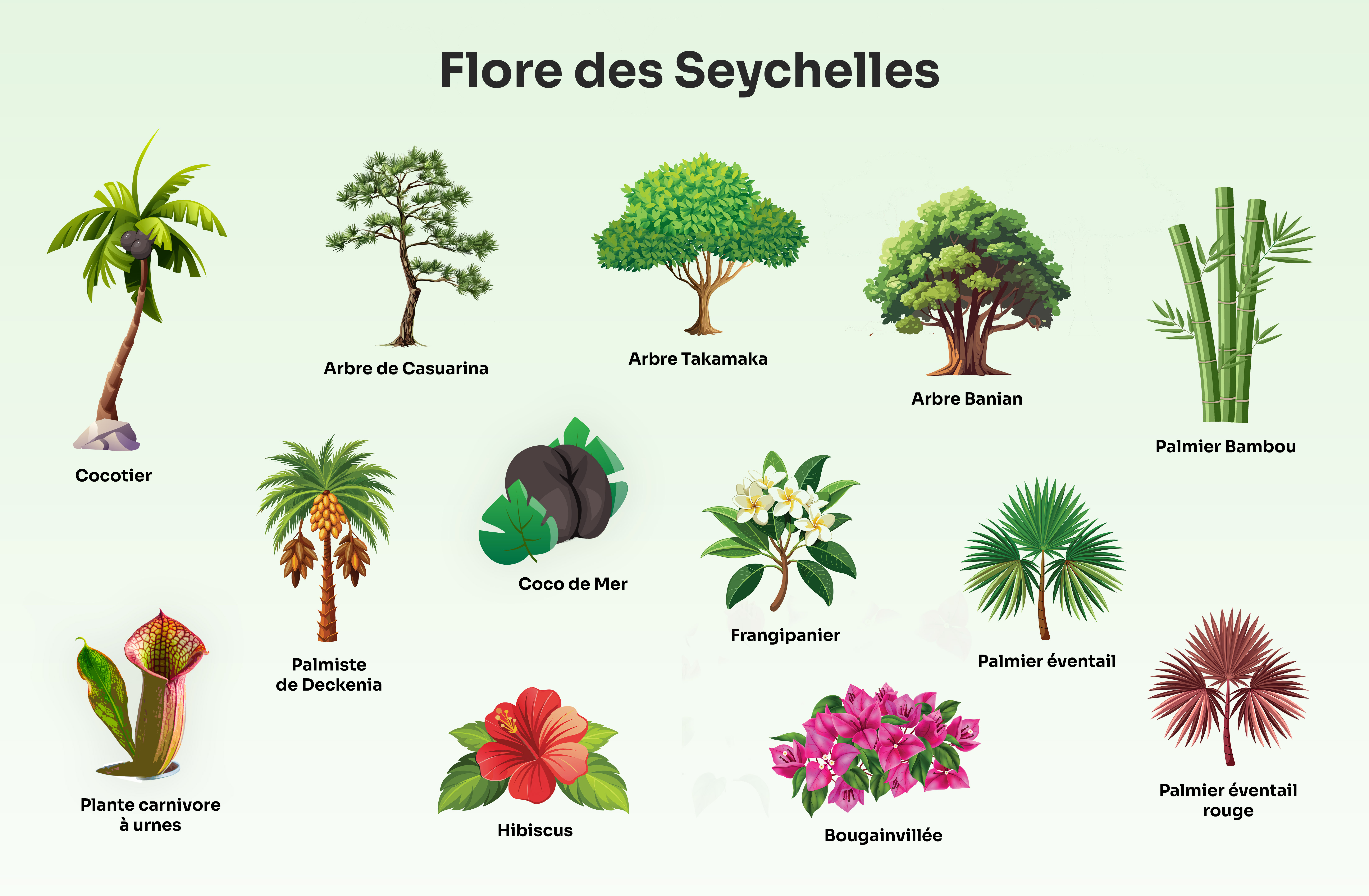 L’une des plantes les plus répandues est la noix de coco, dont la chair séchée, le coprah, était autrefois l’une des principales exportations des Seychelles. Outre les plantes ornementales telles que les bougainvillées, les hibiscus et l’arbre flamboyant, le thé et les herbes poussent également bien aux Seychelles. Sans parler des nombreux fruits tropicaux, comme par exemple la banane, l’ananas, la carambole, la mangue, la papaye, fruit de la passion, l’avocat la citrouille et beaucoup plus. Malheureusement, les nombreuses plantes importées ont eu, bien évidemment, un impact sur les espèces végétales indigènes.
