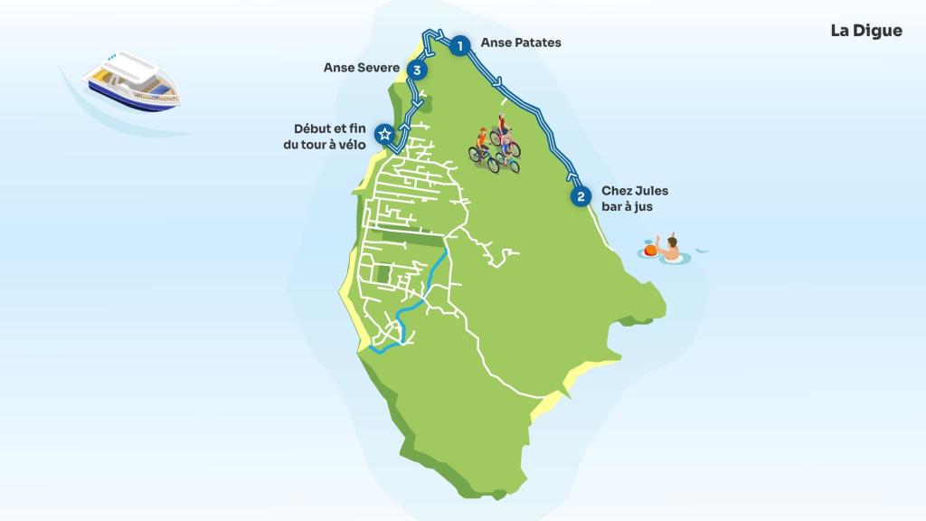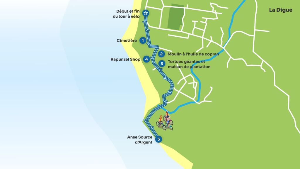 De nombreux hébergements à La Digue proposent des vélos à la location. Dans la plupart des cas, vous pouvez louer un vélo directement à votre arrivée. Si votre hébergement ne propose pas de vélos, vous pouvez en louer dans l'un des magasins officiels de location de bicyclettes situés autour du port.