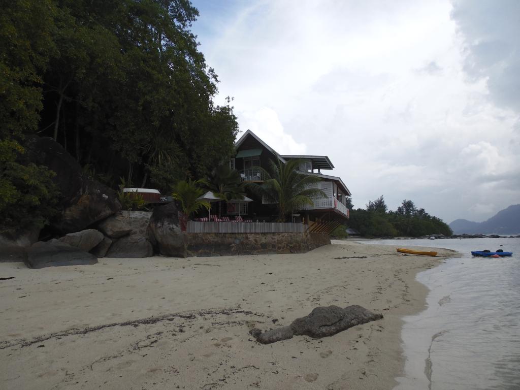 La maison est posée sur son rocher les pieds dans l’eau, on y accède uniquement par la plage ou en bateau quand la marée est haute. Sur des terrasses en étage taillées aux formes de la roche, on trouve une piscine un jacuzzi et le coin barbecue. L’intérieur décoré avec grand soin est chaleureux et rien ne manque. On trouve même de quoi se restaurer pour le premier soir, sympa. Il faut dire qu’il n’y a aucun commerce sur Cerf, heureusement Jerry assure la navette pour aller aux courses. Il y a aussi des canoës à disposition avec lesquels nous ferons le tour de l’ile et nous nous déplacerons vers les sites de snorkeling. Le soir lorsque la marée monte, des raies aigles à pois viennent tourner devant la maison en faisant sortir de l’eau le bout de leurs ailes. Des petits requins léopards nous font également une petite visite.