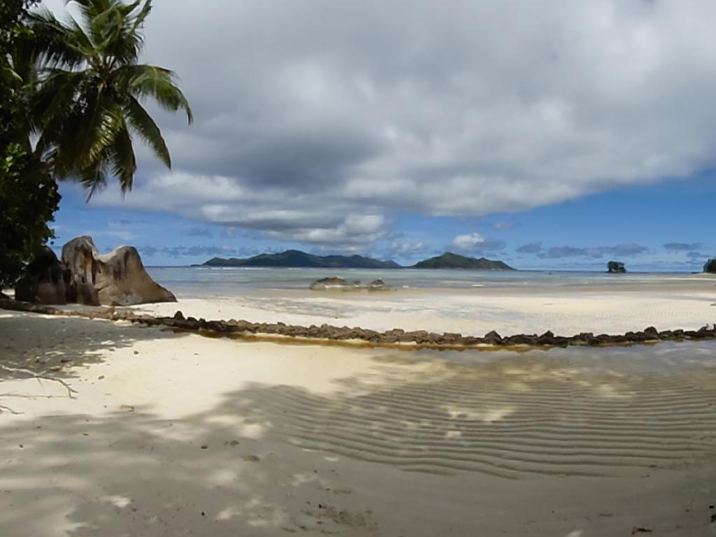 Le jour du départ tant attendu est enfin là. Arrivés à l’aéroport de Mahé, les hôtesses de la société Créole nous prennent en charge et nous sommes acheminés en minibus au port de Victoria. Après des heures d’avion, les aéroports,.., nous pensions que la traversée pour la Digue serait une formalité : erreur ! Nous prenons place à bord du Cat Coco, la navette rapide inter-iles. Est-ce la fatigue, les vagues, bref, c’est un peu verdâtre que nous arrivons à la Digue. Le taxi nous dépose au Zerof Guesthouse, la dame est confuse, car notre maison pour quatre ne peut être libre que le lendemain, nous logeons donc pour la soirée dans deux appartements pour deux, communiquant, c’est encore plus grand, les filles sont ravies. Affamés nous trouvons une pizzeria à deux pas et dévorons une Yellow House, la pizza aux ananas. Bonne nuit.