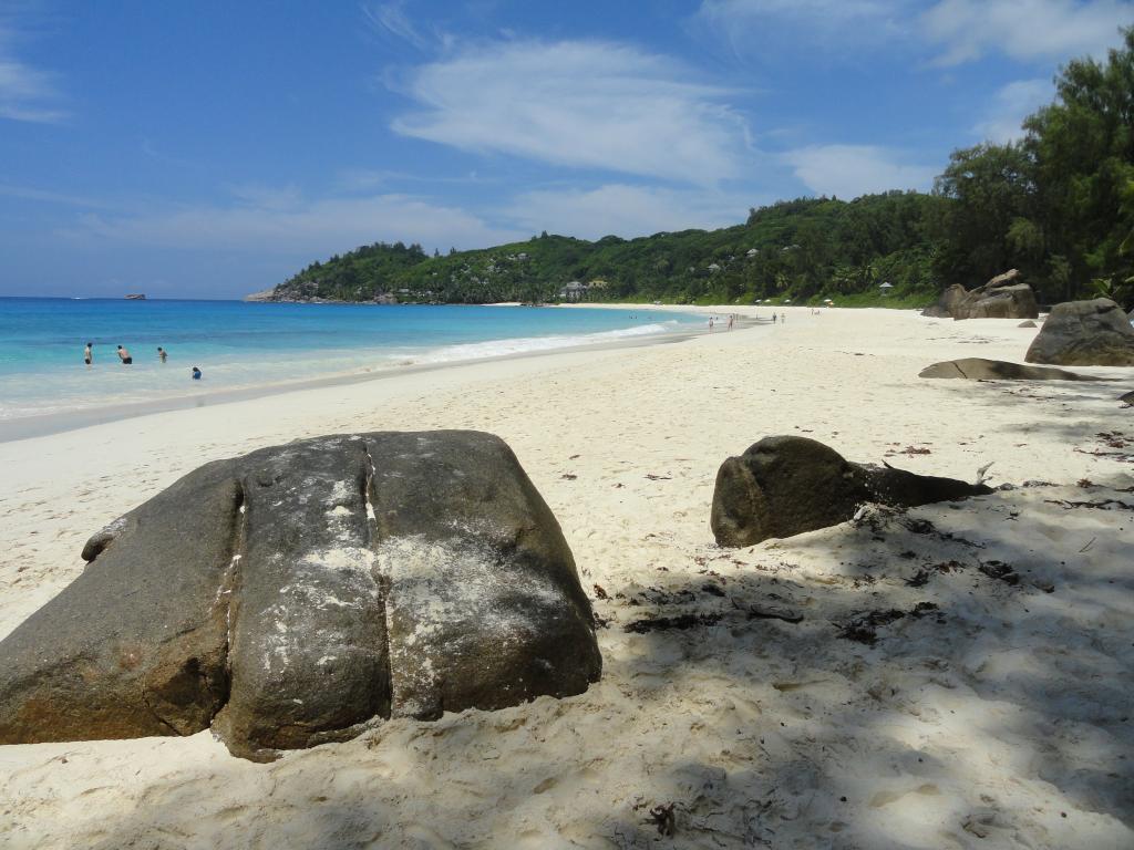 Après un repos bien mérité nous découvrons les lieux de jour, c’est magnifique ! Le personnel nous installe dans notre maison, c’est impeccable, les vacances peuvent commencer. Francine de l’agence Créole passe nous voir pour s’assurer que tout se passe bien, elle nous indique un loueur de vélo, qui pourra nous faire une petit geste si l’on vient de sa part. En début d’après midi, nous sommes équipés de nos destriers et filons vers la plage de Grand Anse. La petite route serpente à travers une jungle luxuriante parsemée de blocs granitiques de toutes tailles. Quelques cotes et descentes plus tard, et oui ce n’est pas plat, c’est une véritable carte postale qui s’offre à nous : sable blanc, eau turquoise, cocotiers et cerise sur le gâteau, la plage est déserte.