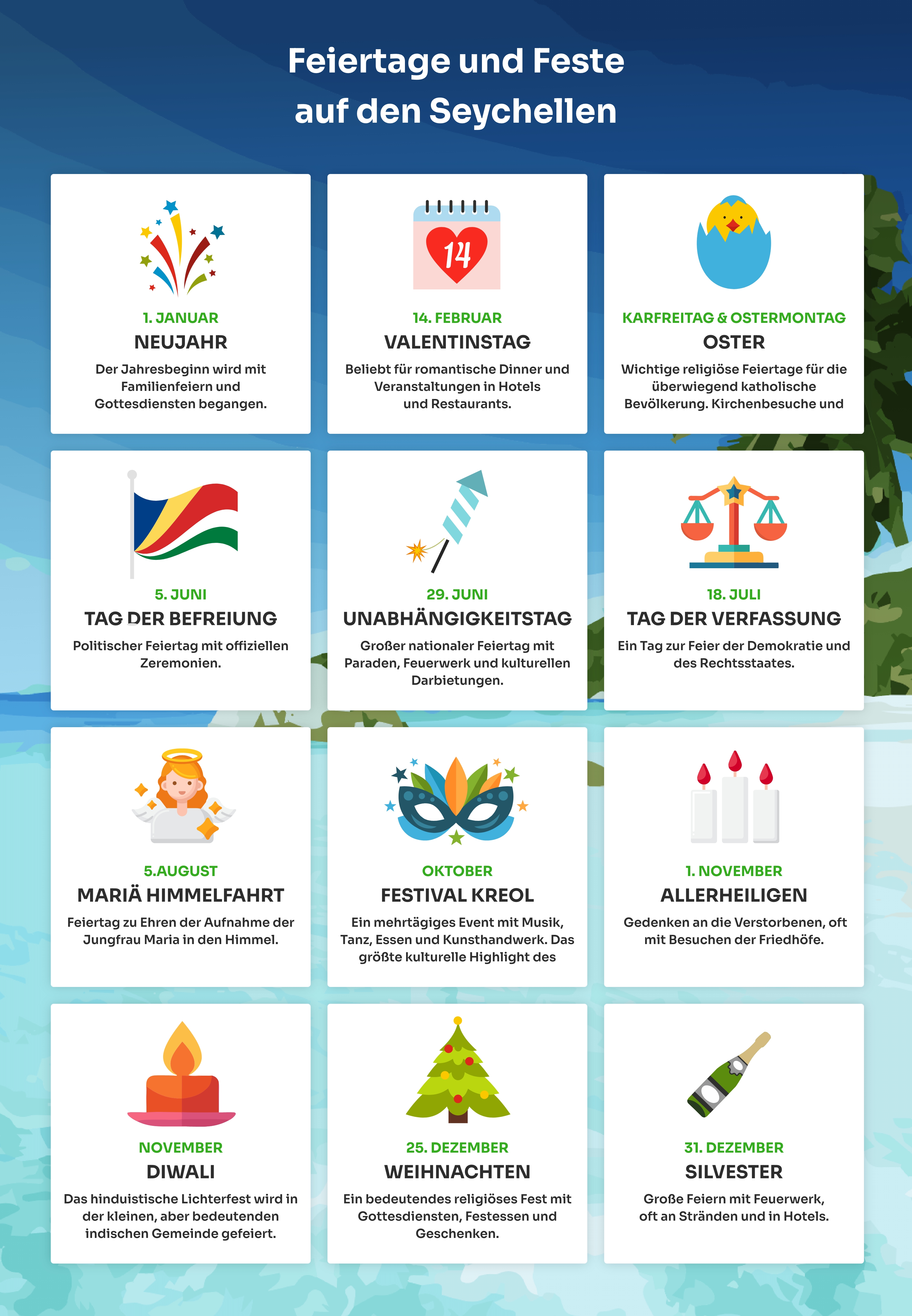 Die Seychellen bieten nicht nur kulturelle Festivals, sondern auch eine Vielzahl von Feiertagen, die das Leben der Inselbewohner prägen und spannende Einblicke für Besucher bieten. Diese Tage haben oft religiöse, historische oder nationale Bedeutung.