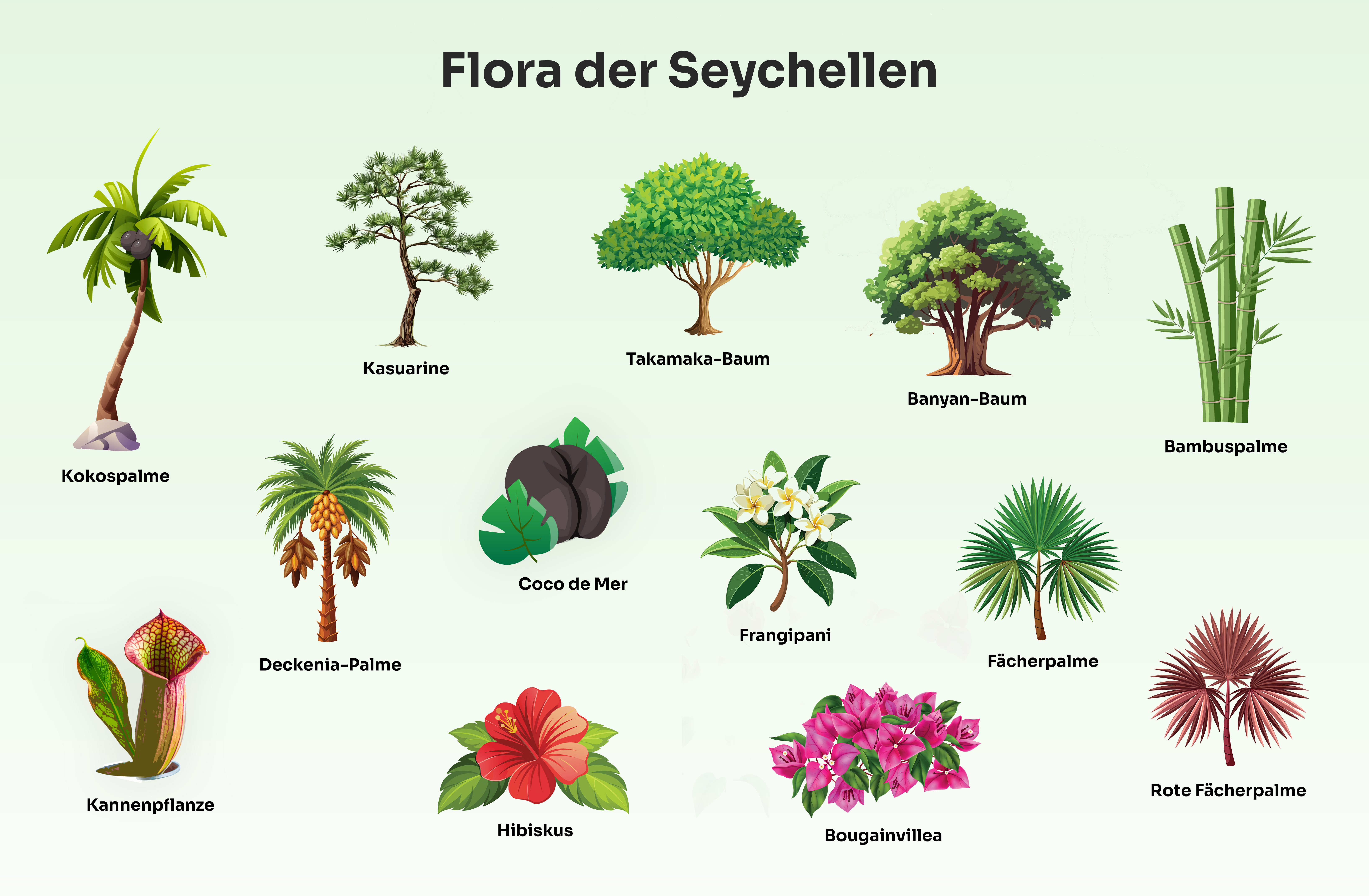 Aufgrund der abgeschiedenen Lage und der Tatsache, dass die Seychellen bis vor 250 Jahren unbewohnt waren, haben hier Arten überlebt, die andernorts der Evolution und der Ausrottung durch die Menschen zum Opfer fallen mussten. Aus diesem Grund gibt es auf den Inseln besonders viele endemische Pflanzenarten, also solche, die nirgendwo anders natürlich vorkommen. Bis heute haben sich 75 dieser Pflanzenarten erhalten. Einige Spezies kommen sogar nur auf einzelnen Inseln des Archipels vor. Manche von ihnen sind eher unscheinbare Gewächse wie Gräser, Kräuter oder Büsche. Rotholz- und Eisenholzbäume, der Zopf- und der schon für ausgestorben gehaltene Quallenbaum sind hingegen in ihrer Erscheinung schon recht imposant.