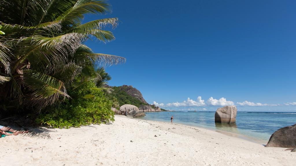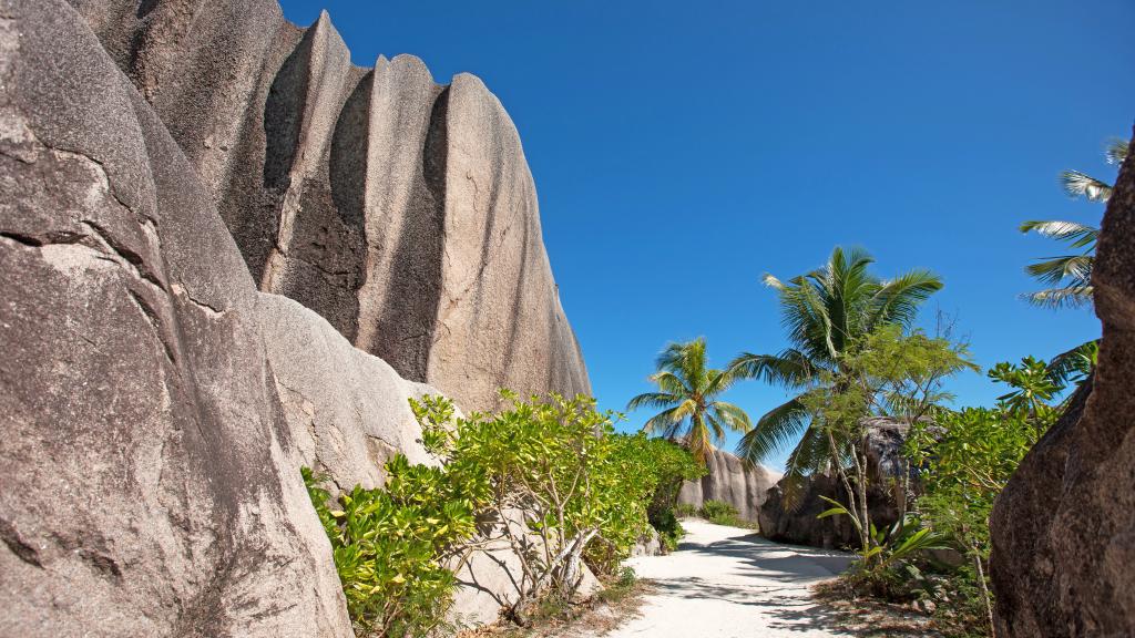 Der Fußweg führt nach einigen weiteren hundert Metern schließlich zu den mächtigen und eindrucksvollen Felsformationen, die den schmalen Anse Source d'Argent-Strand über seine gesamte Strecke von etwa 1.000 m flankieren. In atemberaubender Harmonie verschmelzen hier die dunklen Felsen, die grünen Palmen, der weiße Strand und das türkisblaue Meer miteinander zu einer Kulisse, die ihresgleichen sucht.
