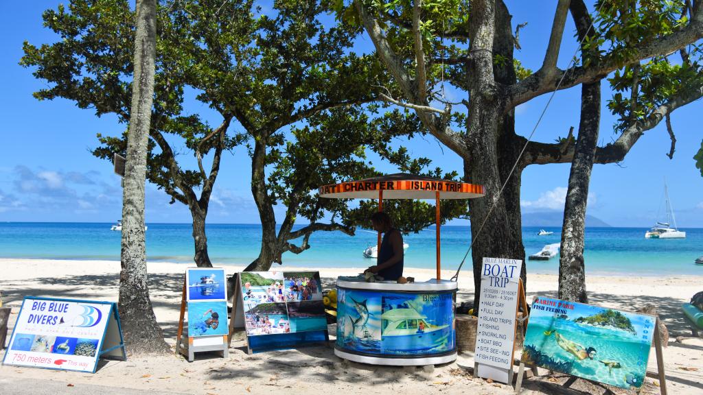 Von Victoria aus ist man mit dem Auto in 15 Minuten am Strand. Man fährt dafür zunächst die Revolution Avenue nach Nordosten, passiert an deren oberem Ende das etwas verfallen aussehende Kolonialhaus Marie Antoinette und folgt links dem Straßenverlauf, der sich in engen Kurven hinaus zum Pass St. Louis schlängelt. Rechts und links der Straße kann man ein wenig vom Leben des seychellischen “Ottonormalverbrauchers” sehen: Man erkennt ein interessantes Nebeneinander von modernen Appartmenthäusern und farbig angestrichenen Holzhäusern mit Wellblechdächern, letztere oftmals blitzsauber hergerichtet, mit Spitzengardinen, schönen Terrasenmöbeln und nicht zu vergessen einer auf dem Dach installierten Fernsehantenne. Nach dem Überschreiten der Passhöhe von St. Louis mutet die Gegend an wie eine andere Welt. Hier gibt es keinen städtisch dichten Verkehr mehr, hier hört man keine hupenden Fahrzeuge, hier herrscht herrliche Ruhe - Zeit zum Durchatmen.