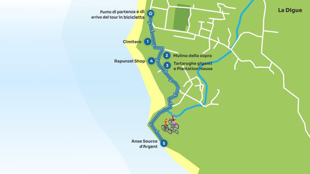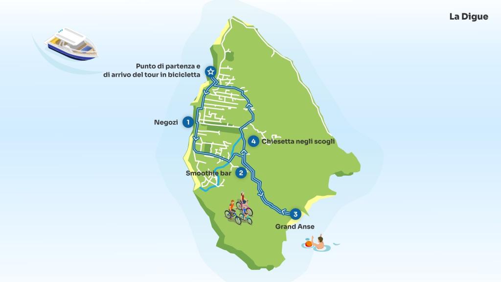 Molte strutture ricettive a La Digue offrono biciclette a noleggio. Nella maggior parte dei casi è possibile noleggiarle direttamente all'arrivo. Se il vostro alloggio non ne dispone, potete noleggiarle presso uno dei negozi ufficiali di noleggio biciclette situati intorno al porto.
