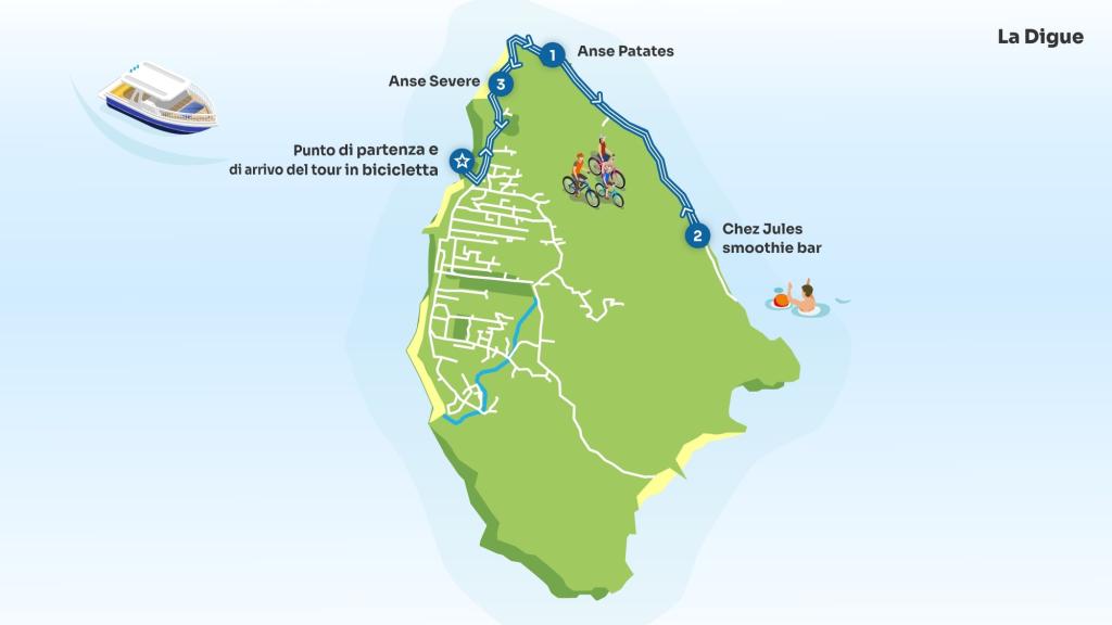 Per un tour in bicicletta verso il lato nord-est di La Digue e quindi verso il famoso smoothie bar "Chez Jules" è necessario pianificare circa 2 - 4 ore, a seconda dell’eventuale “pausa bagno” durante il percorso. Questo itinerario è particolarmente consigliato nel pomeriggio, perché al ritorno potrete godervi il tramonto ad Anse Severe. Partite dal vostro alloggio e dirigetevi a nord (verso Anse Severe). Assicuratevi di portare con voi costume da bagno, crema solare e acqua! Superate l'hotel Le Domaine de L'Orangeraie e poi risalite la collina. Poco dopo raggiungete Anse Severe…attenzione alle tartarughe giganti sulla strada! Proseguite lungo la costa, tra salite e discese. Da qui è bellissimo godersi la vista panoramica sul mare! Poco dopo arrivate ad Anse Patates, una delle migliori spiagge dell'isola. Fermatevi qui per una nuotata prima di proseguire lungo la strada verso "Chez Jules". Una volta arrivati al bar, potete provare uno dei tanti succhi di frutta! Se lo desiderate, anche un cocktail di frutta con rum Takamaka. L'atmosfera rilassata del bar e la leggera brezza marina sono semplicemente una combinazione perfetta! Sulla via del ritorno, potete fare una sosta in una delle piccole spiagge e godervi di nuovo l'acqua fresca del mare, prima di tornare ad Anse Severe, dove vi aspetta un bellissimo tramonto!