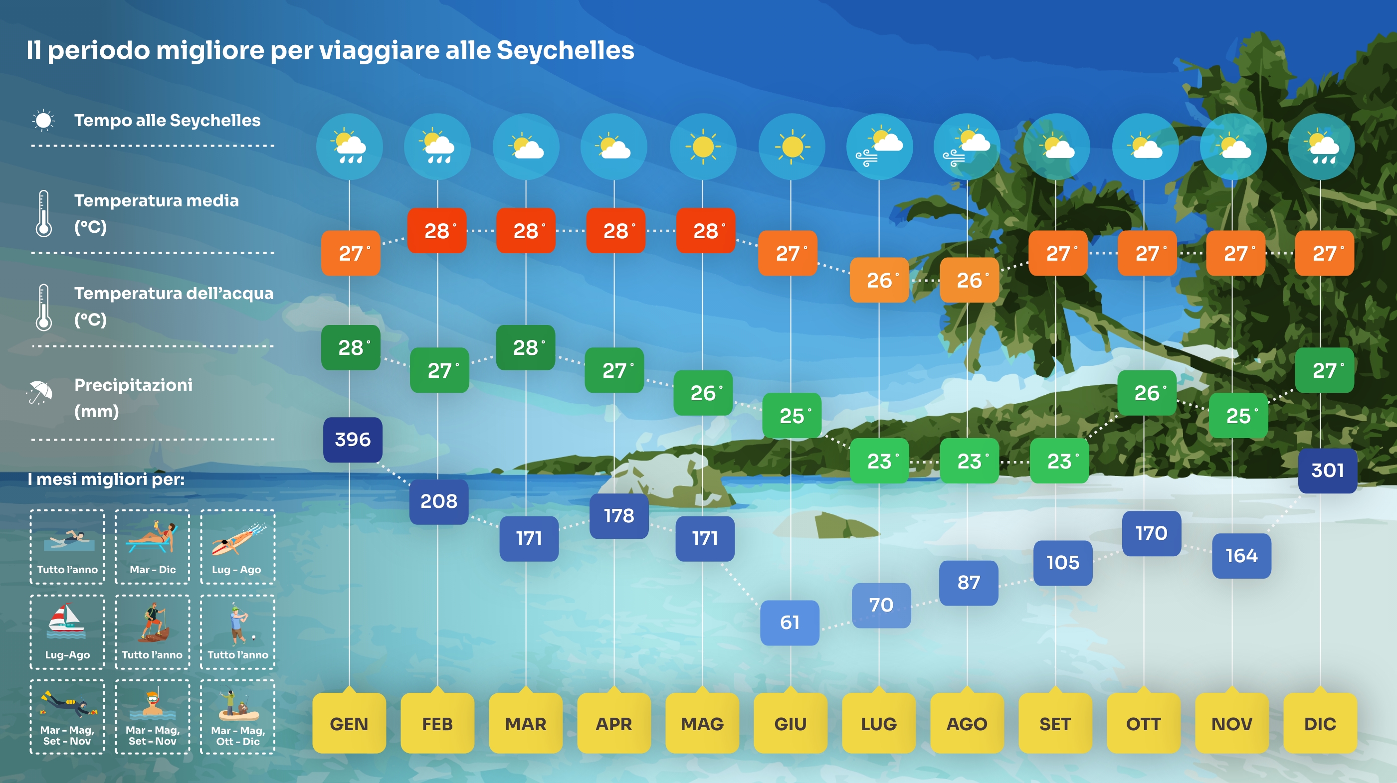 Alle Seychelles c’è un clima tropicale caldo durante tutto l’anno, con temperature giornaliere medie tra i 26 ed i 32 gradi. A causa della vicinanza all’equatore, le temperature rimangono pressoché invariate nel corso dell’anno, rendendo le Seychelles una meta visitabile in qualsiasi mese dell’anno. Esistono comunque delle minime differenze stagionali causate dai venti, più precisamente dagli alisei. Queste piccole differenze rendono certi mesi più adatti a determinate attività (ad es. snorkelling, trekking, etc.) rispetto ad altri. Per decidere quando andare, è bene considerare quali attività si desiderano praticare durante la propria vacanza.