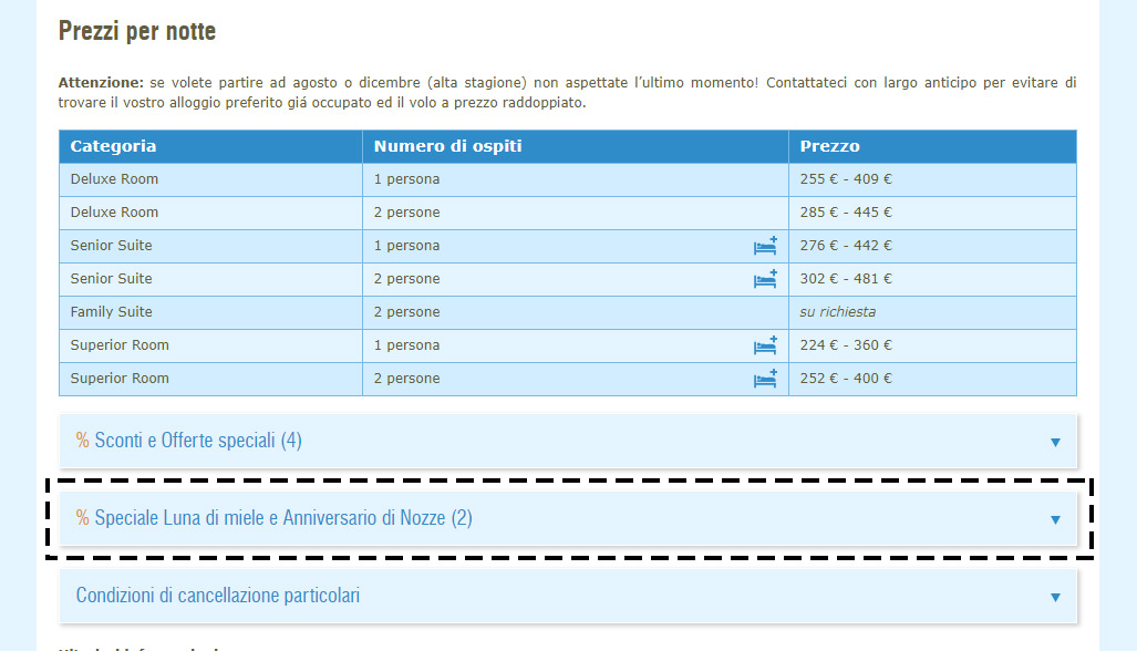 Offerte e trattamenti speciali sono disponibili per gli anniversari di matrimonio e possono essere prenotati sul nostro sito o su richiesta. Si prega di consultare la descrizione dell'hotel per maggiori informazioni sulle date e sugli orari.