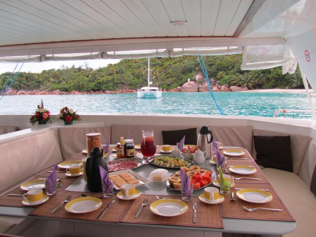Così appena mia moglie ha accettato, complice la ricorrenza del nostro 25 anniversario di matrimonio, ho cercato tramite internet mille diverse soluzioni, anche se in realtà la crociera di sette giorni, sul catamarano che avevo visto sul sito della Seyvillas, VPM Cocktail Créole, poteva rispondere a tutte le nostre necessità e aspettative, (catamarano di grandi dimensioni, quindi con grandi spazi a disposizione, cabine molto più grandi rispetto ad una normale barca a vela, maggiore stabilità alla fonda ed anche in navigazione, possibilità di visitare diverse baie accedendo proprio via mare...perfetto). Detto fatto ho prenotato, (non prima di aver disturbato più volte le ragazze di SeyVillas, che con una pazienza infinita hanno risposto a tutte le domande che mia moglie mi preparava).