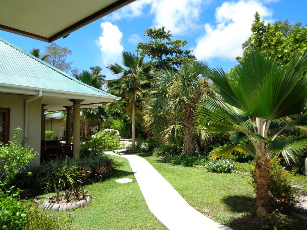 Über Abu Dhabi flogen wir mit Etihad bis Mahé, die restlichen 45 km nach Praslin mit einer kleinen Propellermaschine (13 Minuten). Am Flughafen Praslin stand unser Mietwagen (Linksverkehr!). Zu unserer Unterkunft an der Ostküste von Praslin, den Cote D'Or Chalets an der gleichnamigen "Goldküste" (Anse Volbert (Cote d'Or)), fuhren wir nur eine knappe halbe Stunde. Die netten Damen, die "guten Geister" der Anlage dort, kümmerten sich um Wohlbefinden und Behaglichkeit und waren stets zu einem kleinen "Schwätzchen" bereit. Jeden Tag bis 15.30 waren sie anwesend und halfen bei Fragen und Wünschen, obwohl bei uns (gebucht bei SeyVillas / nur Unterkunft) nichts zusätzlich zu verdienen war.