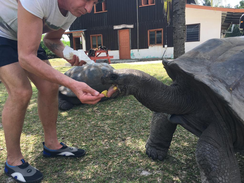 Partenza ore 9:30 verso le 10 arriviamo a Curieuse Marine National Park, dopo circa 30 minuti di trekking su di un lungo sentiero in parte su passarelle di legno, tra una fitta foresta di mangrovie, arriviamo alla spiaggia dove vivono più di 100 tartarughe di Aldabra, la riserva è sede dell’allevamento e della nidificazione delle stesse.