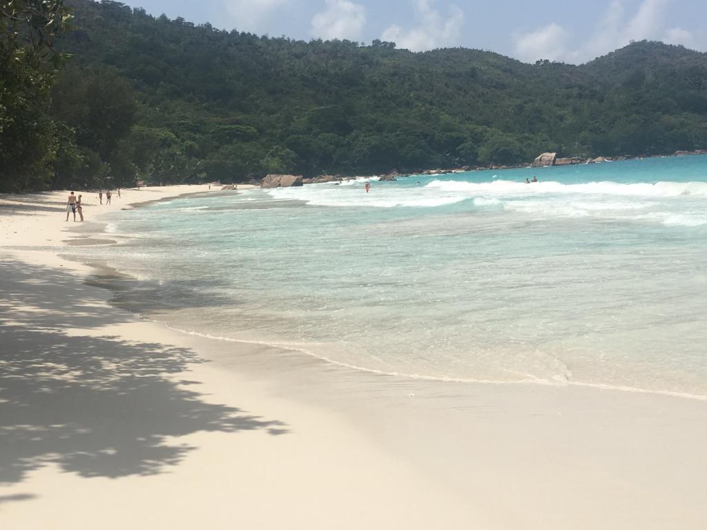 Dopo uno spuntino in un take-away, ci dirigiamo verso sud-est ed arriviamo, dopo una bella biciclettata un po' in salita, a Grand Anse, la più lunga spiaggia di sabbia bianca di La Digue; bella, ampia e con potenti onde che si infrangono sulla spiaggia è ottima per il surf.