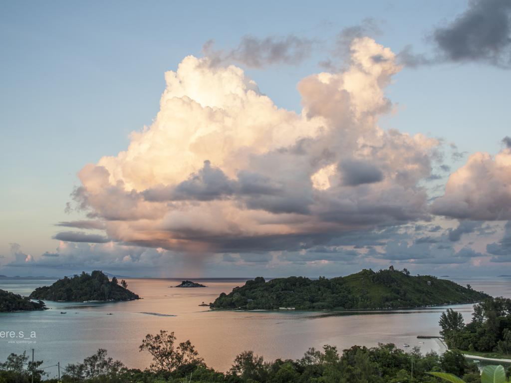 Zurück auf Cerf holen wir uns an der Bar einen Gin Tonic und lassen uns damit zum Sonnenuntergang zum Heli Landeplatz rauf bringen. Am Abend gibt’s ein Kreolisches Buffet (sehr guter Red Snapper) mit Live Musik – für den Abend sind alle traditionell gekleidet und der sonst etwas ungemütliche Speiseraum ist endlich schön mit Blumen dekoriert. Wir lernen den Restaurantmanager kennen und unterhalten uns relativ lange mit ihm. Er erzählt uns, dass sie sehr darauf achten, nur frische Lebensmittel zu kaufen und das Problem haben, dass sie fast alles importieren müssen. Dazu kommen sehr strenge Quarantäne und Umweltschutzbestimmungen. Wir machen mit ihm aus, dass wir am letzten Tag zu Mittag eine Meeresfrüchte-Platte mit Lobster essen.