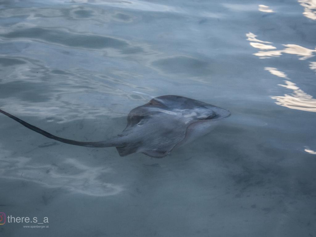 Unseren letzten Tag auf Praslin verbringen wir gemütlich. Eigentlich fehlt uns für ein vollwertiges Sightseeing-Programm noch das berühmte Valleé de Mai, da ich aber mit Halsschmerzen kämpfe, heben wir uns das und vieles weitere für einen nächsten Urlaub hier auf. Beim Cafe des Arts schauen wir noch in die Boutique, die ein paar entzückende Kleider, Badehosen, Strandtaschen und Souvenirs hat. Am Strand ist heute etwas mehr los, es sind nicht nur Hotelgäste, sondern auch Leute mit Mietwagen hier. Später am Nachmittag hat ein deutscher Tourist eine weniger glückliche Begegnung mit einem der Stachelrochen – er kommt humpelnd und mit einem tiefen Schnitt am Fuß aus dem Wasser, in das er zuvor gesprintet ist.