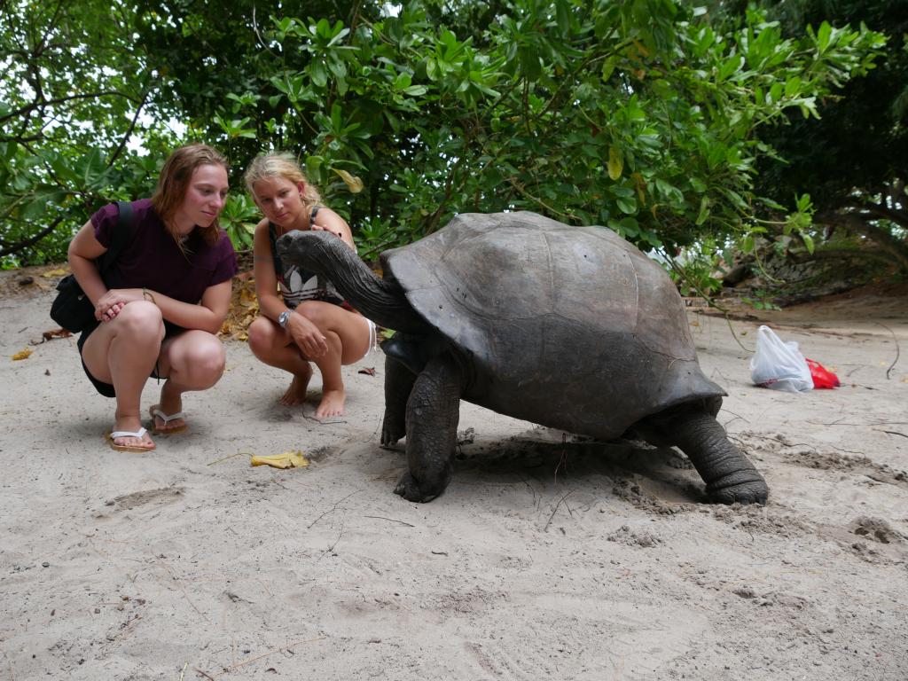 Die farbenfrohe Unterwasserwelt wurde durch die zahlreichen Seeigel noch spannender- und auf der Rückfahrt mit dem Beiboot zu unserem Katamaran begleiteten uns Delphine. Als wir am nächsten Tag bei strahlendem Sonnenschein auf die Insel "Cousin" zufuhren,waren wir schon von weitem von der Bilderbuchschönheit der Insel beeindruckt. Ein wunderschöner Sandstrand, ein einzelner Mensch am Strand, der sich später als Ranger outete und zwei Strohhütten. Wir fuhren mit dem Beiboot bis uns der Ranger andeutete wir dürfen nicht weiter mit dem Boot, so dass wir das letzte Stück an Land schwammen. Wie Robinson Crusoe wurden wir von den sehr hohen Wellen an Land geworfen, wo wir dann erstmal atemlos im Sand lagen. Doch leider war das Robinson-Grusoe-Feeling schnell vorbei, als uns der Ranger freundlich aber bestimmt sagte, wir dürfen leider nicht bleiben, da am Sonntag "Ruhetag" für Tiere und Pflanzen ist. Das haben wir gerne akzeptiert, denn die Seychellen sind wirklich ein Naturparadies, das eben von diesen Rangern sehr gehegt und gepflegt wird und es den Besuchern ermöglicht noch solch intakte Naturräume auf dieser Erde vorzufinden. Das lassen sie sich dann mit 38,-- Euro Eintritt pro Person schon auch gut bezahlen- aber es ist sicher gut investiertes Geld!