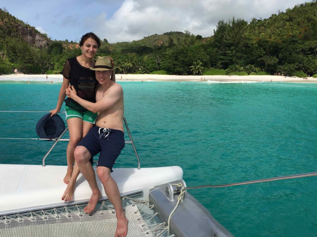 Zurück per Schlauchboot auf dem Katamaran Entspannung für die Füße und Verwöhnung für den Gaumen. Denn mit im Paket ist ein erstklassiges Lunch inklusive Grillspezialitäten. Auch drei Getränke sind im Exkursionspreis von 125 Euro enthalten, sodass es keine Zusatzkosten gibt. Während des Essens steuerte die stets sehr freundliche Crew fast unbemerkt das nächste Highlight an. Am, unseres Erachtens nach, schönsten aller Seychellen-Strände Anse Georgette ankert der Katamaran. Er wird nicht direkt mit Schlauchboot angefahren, dafür hat man hier gleich eine Stunde Zeit in ca. zwei Minuten zu ihm hinüber zu schwimmen und ihn mit seinem feinsten weißen Sand in vollen Zügen zu genießen.