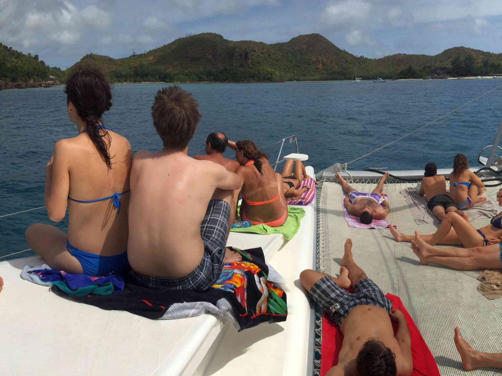 Zurück an Bord bekommt man noch ein Dessert aufgetischt und verbringt die recht lange Rückfahrt zum Hafen Praslins wahlweise unter Deck mit Blick auf ca. ein Drittel aller Praslin-Strände oder tankt auf den Netzen des Bugs die Seychellen-Sonne.