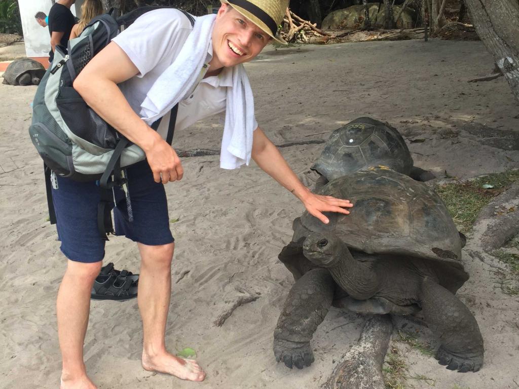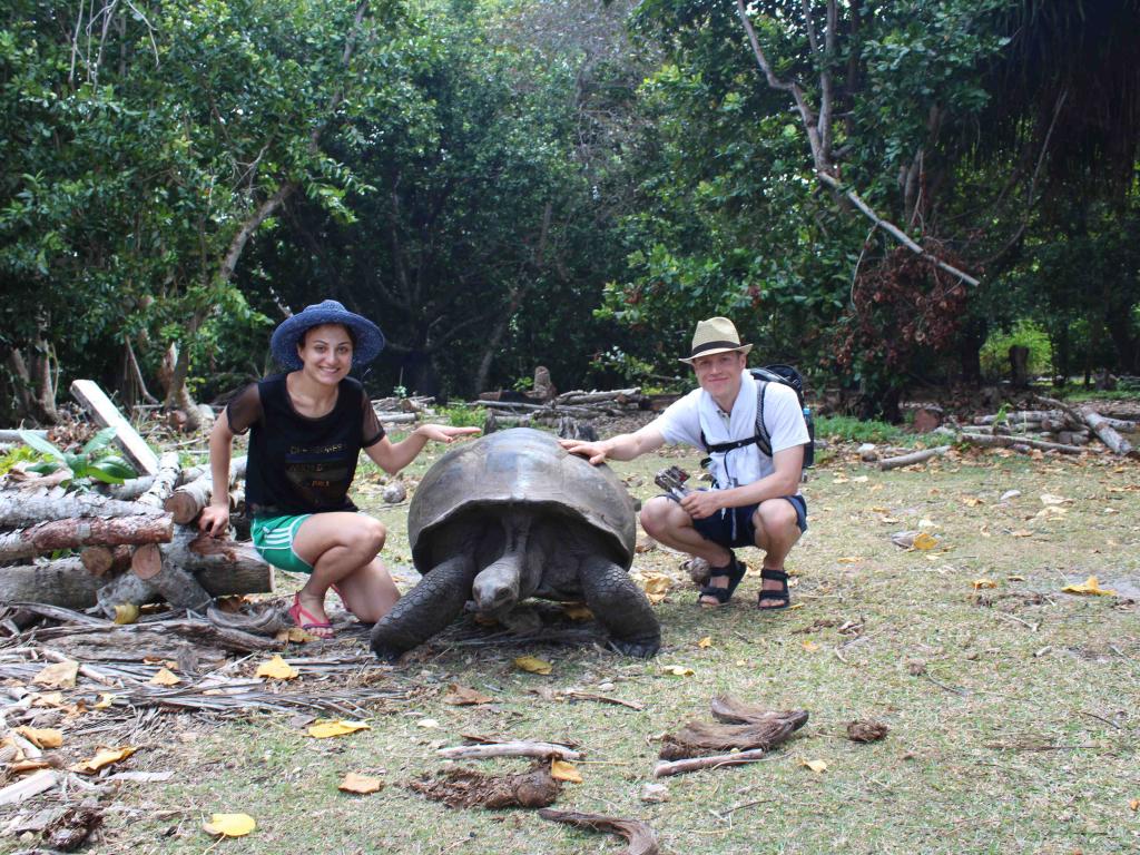 Gegen Mittag dann mittels Schlauchboot-Transfer in vier Gruppen weiter zum Hauptziel: der Riesenlandschildkröten-Population auf Curieuse, der man sehr nah kommt. Der einheimische Guide erzählt in kleinen Gruppen alles über sie, man kann sie füttern und man darf sogar Baby-Tortoises in den Arm nehmen. Auch gibt es eine kleine Abhandlung über die Coco de Mer.