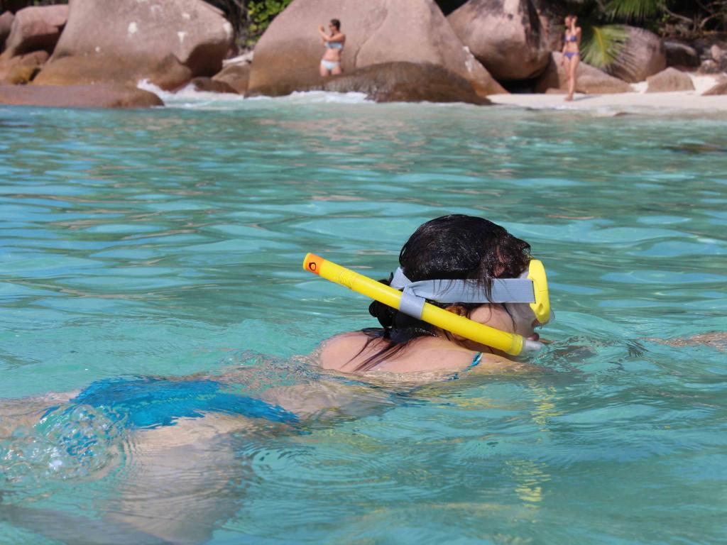 30 Minuten hatten wir um vom Heck des Schiffes in Ruhe das Korallenriff und die dort kreisenden Fische mittels mitgebrachtem Schnorchel-Equipment zu erkunden. Zwar ist die Vielfalt der Fische nicht so groß wie z.B. an einigen La Digue-Stränden, aber für unerfahrerne Schnorchler schon beeindruckend.