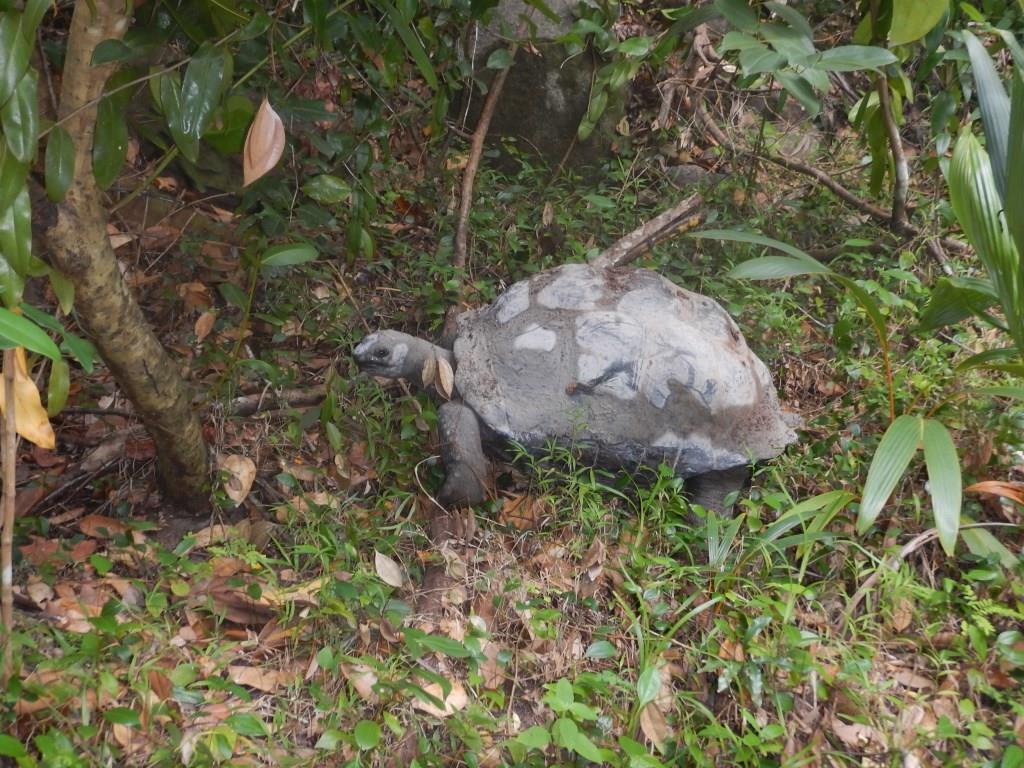 Auf dem Rückweg schlugen wir noch eine kleine Erkundung des Tropenwaldes auf die andere Seite von Cerf ein und begegneten einer Landschildkröte, die gemächlich durch das Dickicht wanderte.