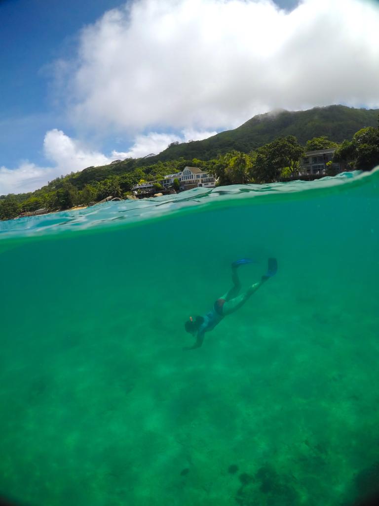Nach Weihnachten geht es auch schon weiter nach Mahé, wo wir im Bliss Hotel mit Halbpension untergebracht sind. Das Hotelpersonal ist unglaublich freundlich und wir haben das beste Zimmer überhaupt, mit direktem Meerzugang. So lassen wir hier noch einmal so richtig die Seele baumeln: Wir schlemmen an den fantastischen Frühstücks- und Abendbuffets mit lokalen Spezialitäten, dem Silvester-Galadinner und Schnorcheln jeden Tag mehrmals am Hausriff. Hier gibt es von Hummern, Sepien, Schildkröten über Krebse und natürlich den vielen bunten Fischen alles zu sehen.