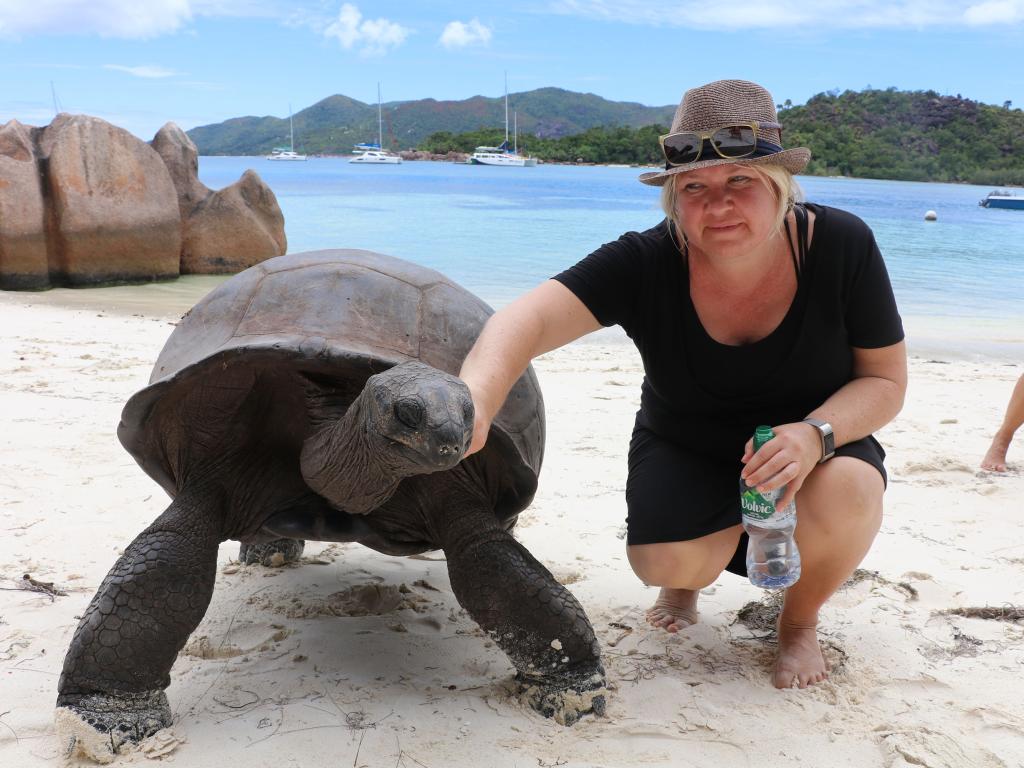 , Anse Georgette nach Curieuse, dort wurden wir zum Baden im türkisblauen Wasser abgesetzt und sollten dann über einen Weg zur anderen Seite der Insel laufen, der Weg führte durch einen kleinen Wald und auf Gipfel mit sensationellen Ausblicken auf die Inselwelt, hinunter führte dann der Weg über Holzstege durch die Mangroven bis wir endlich das Ziel erreichten mit den über 200 frei lebenden Riesenschildkröten, die wir mit Streicheleinheiten bedachten und diese uns mit Stillhalten für tolle Urlaubsbilder belohnten. Hier wurden wir mit einem tollen BBQ verköstigt. Nach diesem Aufenthalt auf Curieuse fuhren mit noch zum Schnorcheln nach St. Pierre, einem winzigen traumhaften Inselchen. Hier wurden wir mit riesigen Fischschwärmen beim Schnorcheln überrascht.