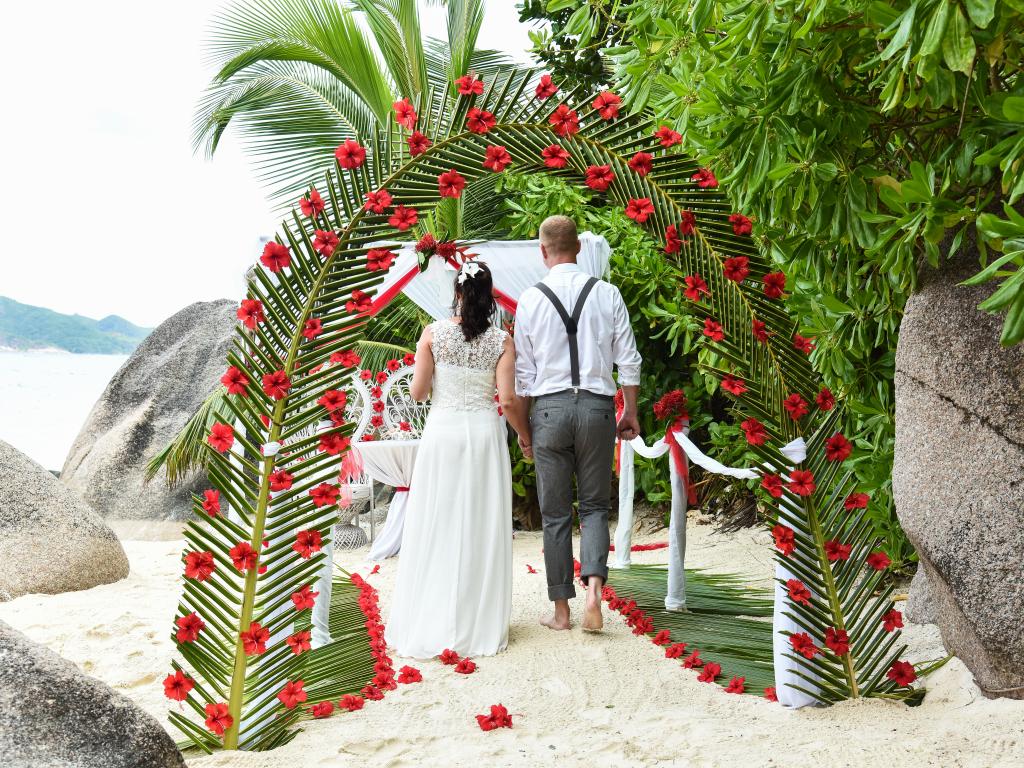 gefahren. Relativ versteckt, hinter den großen Granitfelsen, unter Palmen, direkt am Strand erlebten wir eine wunderschöne Hochzeit.
