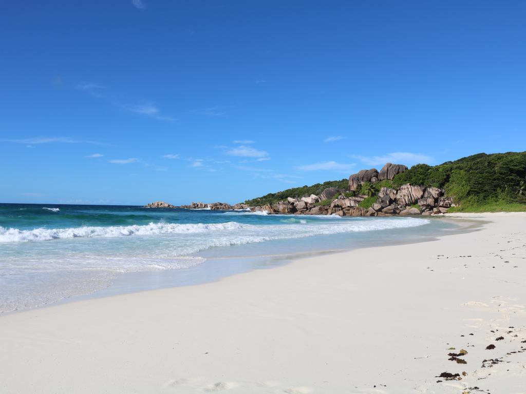 Unser Traumurlaub auf den Seychellen begann auf La Digue. Wir sind direkt nach unserer Ankunft auf Mahé mit der Fähre über Praslin nach La Digue gefahren. Die Fährfahrt erlaubte einem schon die ersten Eindrücke von diesem wunderschönen Fleckchen Erde – ein Sitzplatz auf dem ‚Upper Deck‘ für einen kleinen Mehrpreis ist demnach sehr zu empfehlen. An Land angekommen konnten wir innerhalb weniger Minuten zu Fuß unsere erste Unterkunft Le Repaire Boutique Hotel erreichen. Wir wurden sehr herzlich mit einem selbstgemachten Eistee empfangen und haben uns auf Anhieb wohlgefühlt. Die Anlage und insbesondere der Garten ist sehr gepflegt sowie wunderschön verwinkelt und mündet direkt am eigenen Strandabschnitt. Unser Zimmer war sehr modern, sauber und verfügte über ausreichend Platz, um sich für die ersten Tage einzurichten. Das Hotel wird von einer italienischen Familie geführt und verfügt über ein sehr gutes Restaurant mit absolut leckerer italienischer Pizza und gutem Wein – absolut empfehlenswert.