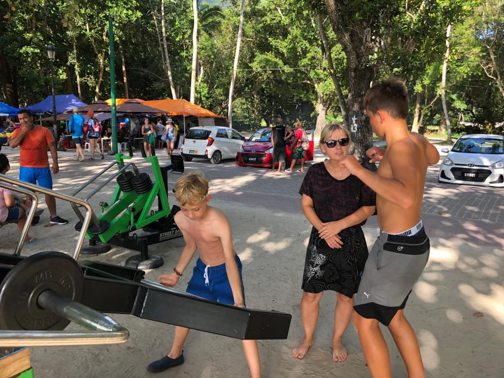 Der Strand Beau Vallon gefällt mir sehr. Hier konnte man sehr gut schwimmen. Hinter dem Strand gab es an einem Fußweg einen langen Markt mit vielen Ständen zum Essen. Street Food Hier könnte man ganze Fische und vieles mehr frisch vom Grill bekommen. In einem kleinen Fittnesscenter im Freien am Strand habe ich immer ein wenig trainiert. Abends gab es einen tollen Sonnenuntergang. Am Restaurant Boat House am Strand gab es super Cocktails für mich und meine Eltern. Daneben habe ich immer frisches Eis gekauft. Schokolade ist mein Favorit.Sport am Beau Vallon