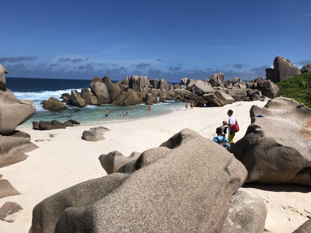 Die nächste Insel war La Digue. Auch hier hat alles super mit dem Abholen und der Fähre geklappt. Wir wohnten mitten im Wald im Gästehaus Belle des Iles Guest House. Da hat man sich wirklich gefühlt wie in einem Baumhaus. Auf der Insel ist man überall mit dem Fahrrad hin gekommen. Wir waren an dem Wunderschönen Strand Anse Source d'Argent. Das ist ein sehr schöner Strand mit Palmen, Pullversand und riesigen Steinen in einem Park. Sehr schön war auch der Strand Anse Marron, zu dem man nur zu Fuß kommt.