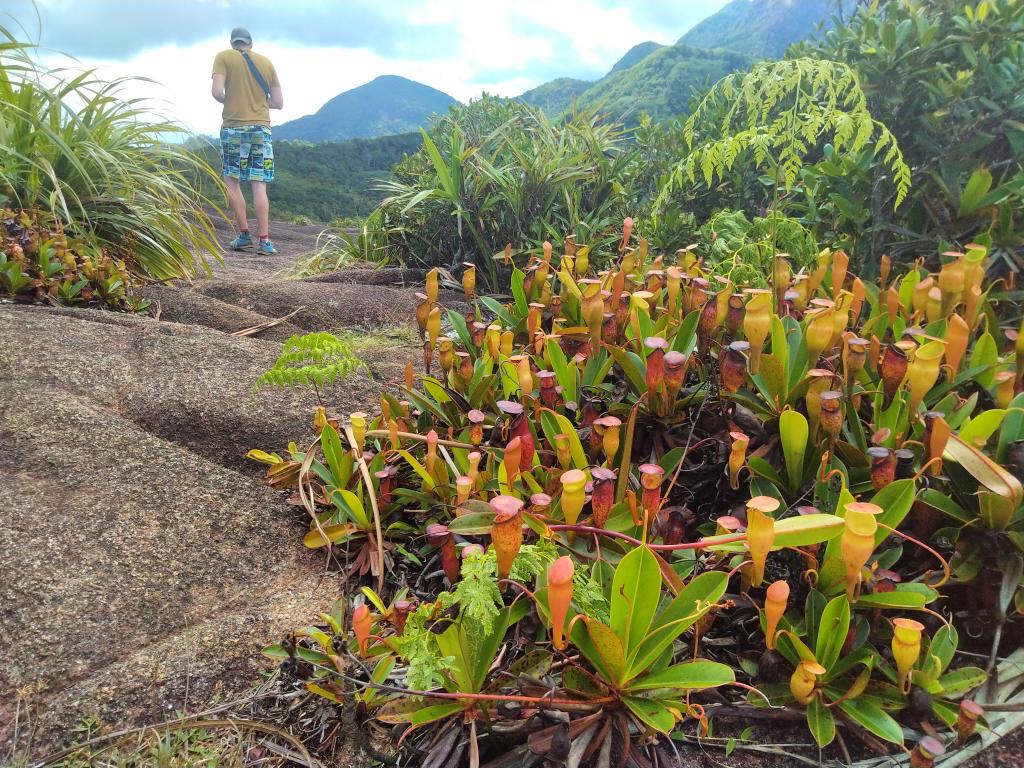 Das Highlight unseres zweiten Tages war der Copolia Lodge Trail . Eine schöne, schweißtreibende Wanderung, die hoch hinauf zu einem Felsen führte. Dort oben angekommen genossen wir eine atemberaubende Sicht herab auf die Hauptstadt Victoria, die künstliche Insel Eden-Island und die vorgelagerten Inseln. Besonders beeindruckt waren wir von den endemischen fleischfressenden Kannenpflanzen.Copolia Trail, Mahé
